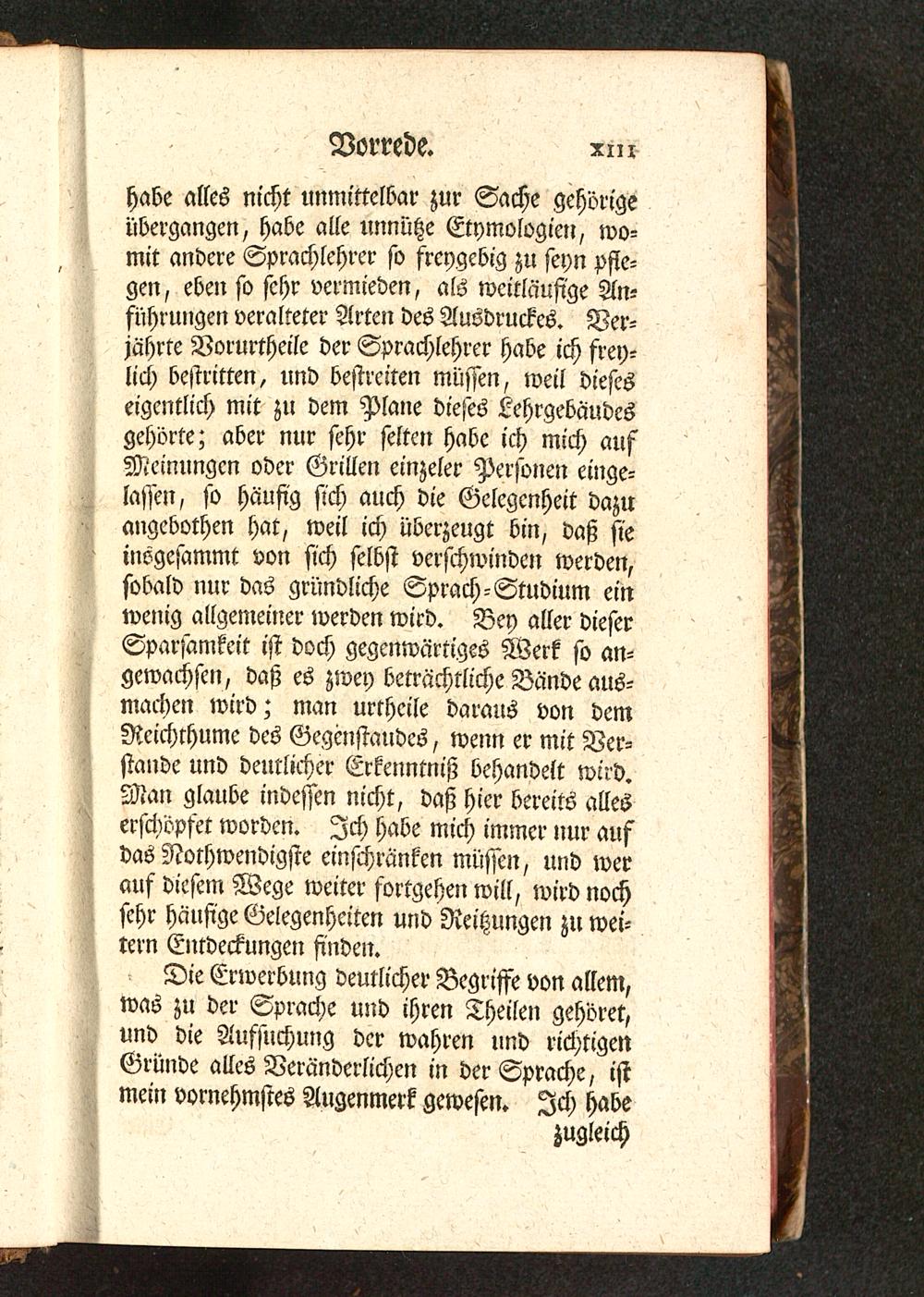 Die Erwerbung deutlicher Begriffe von allem,was zu der Sprache und ihren Theilen gehöret,und die Aufsuchung der wahren und richtigenGründe alles Veränderlichen in der Sprache, istmein vornehmstes Augenmerk gewesen. Ich habe