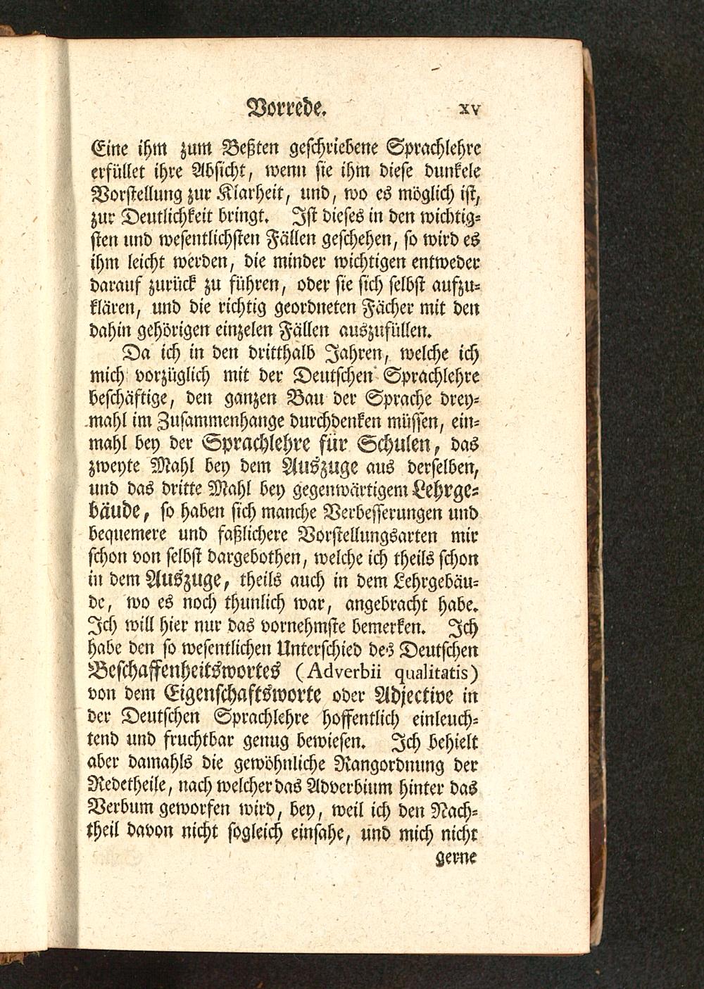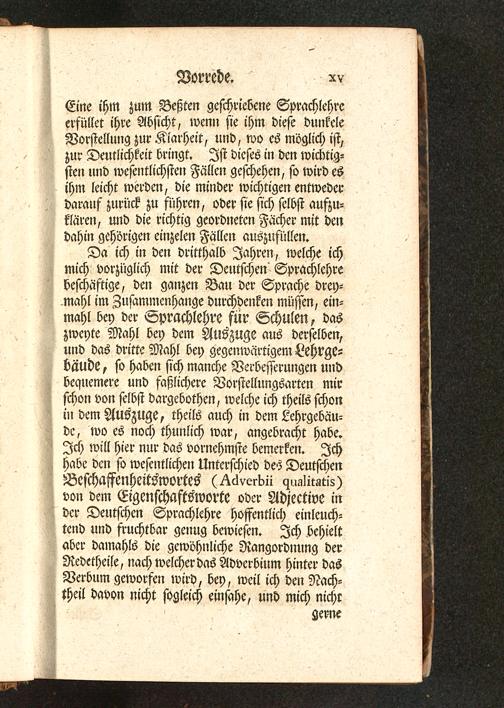 Da ich in den dritthalb Iahren, welche ichmich vorzüglich mit der Deutschen Sprachlehrebeschäftige, den ganzen Bau der Sprache drey-mahl im Zusammenhange durchdenken müssen, eilt-mahl bey der Sprachlehre für Schulen, daszweyte Mahl bey dem Auszuge aus derselben,und das dritte Mahl bey gegenwärtigem Lehrge-bäude , so haben sich manche Verbesserungen undbequemere und faßlichere Vorsiellungsarten mirschon von selbst dargebothen, welche ich theils schonin dem Auszuge, theils auch in dem Lehrgebäu-de, wo es noch thunlich war, angebracht habe.Ich will hier nur das vornehmste bemerken. Ichhabe den so wesentlichen Unterschied des DeutschenBeschaffenheitswortes (H6verdii ^u-M-nis)von dem Eigenschaftsworte oder Adjective in