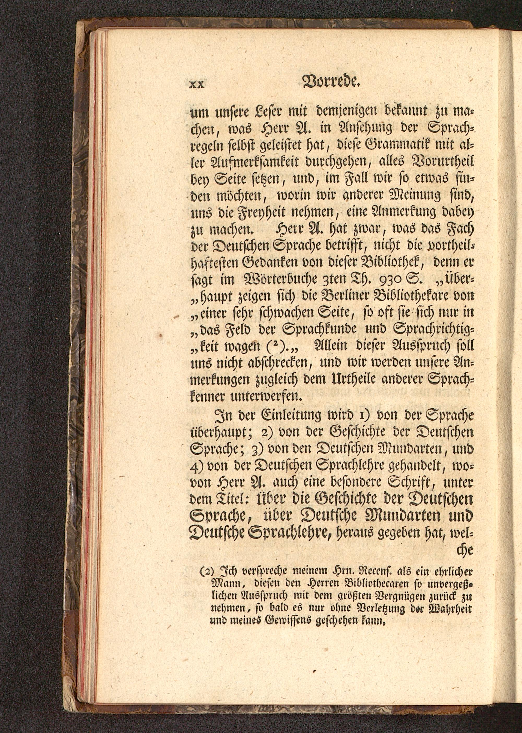 um unsere Leser mit demjenigen bekannt zn ma-chen, was Herr A. in Ansehung der Sprach-regeln selbst geleistet hat, diese Grammatik mit al-ler Aufmerksamkeit durchgehen, alles Vorurtheilbey Seite setzen, und, im Fall wir so etwas fin-den möchtet», worin wir anderer Meinung sind,uns die Freyheit nehmen, eine Anmerkung dabeyzu machen. Herr A. hat zwar, was das Fachder Deutschen Sprache betrifft, nicht die portheil-haftesten Gedanken von dieser Bibliothek, denn ersagt im Wörterbuchs zten Th. 930 S. „Über-haupt zeigen sich die Berliner Bibliothekare von„einer sehr schwachen Seite, so oft sie sich nur in„das Feld der Sprachkunde und Sprachrichtig-„keit wagen Allein dieser Ausspruch soll