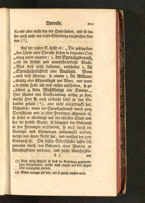 Auf der 22sten S. heißt es: „ Die gesetzgeben-den Theile einer Sprache stehen in folgender Ord-nung untereinander: i. der Sprachgebrauch,„als die höchste und unumschränkteste Macht.„Was diese nicht bestimmt, entscheidet 2. die„SprachÄhnlichkeit oder Analogie. Wenn„auch diese schweigt, so nimmt z. die Abstam-„mung oder Etymologie das Wort, und wenn„in einem Falle alle diese nichts entscheiden, so ge-bühret 4. dem WolMange eine Stimme.,»Hier scheinet eine Einschränkung nöthig zu seyn,welche Herr A. auch vielleicht selbst in den Ge-danken gehabt (4), aber nicht ausgedruckt hat.Nähmlich: wenn der Sprachgebrauch durch ganzDeutschland und in allen Provinzen allgemein ist,so stehet er allerdings auf der obersten Stufe undhat die höchste Macht; ist hingegen der Gebrauchin den Provinzen verschieden, so muß durch dieAnalogie und Etymologie ausgemacht werden,welche voll ihnen Recht hat, und welches der guteGebrauch ist. Die besten Schriftsteller lassen sichzuweilen durch den Gebrauch ihrer Provinz zuUnrichtigkeiten verleiten, und solche Unrichtigkei-