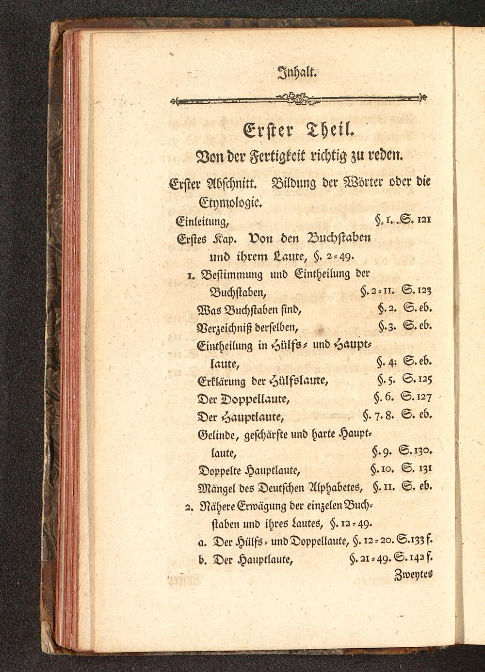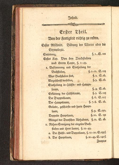 Emrheilung in Hülfs- und Haupt-laute, §.4i S.eb.Erklärung der Hülfslaure, §. 5. S. 125Der Doppellaute, §.6. S.127Der Hauptlaure, §.7.8. S.eb.Gelinde, geschärfte und harte Haupt-laute, §.9. S.izo.Doppelte Hauptlaute, §.10. S. iziMängel des Deutschen Alphabetes, §. 11. S. eb.