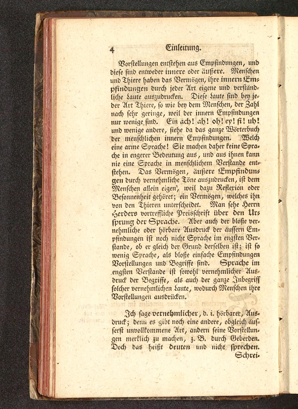 Vorstellungen entstehen aus Empfindungen, unddiese find entweder innere oder äußere. Menschennnd Thiere haben das Vermögen, ihre innern Eni5pfindungen durch jeder Art eigene und verständ-liche taute auszudrucken. Diese taute sind bey je-der Art Thiere, so wie bey dem Menschen, der Zahlnach sehr geringe, weil der innern Empfindungennur wenige sind. Ein ach! ah! oh!ey! fi! uh!und wenige andere, siehe da das ganze Wörterbuchder menschlichen innern Empfindungen. Welcheine arme Sprache! Sie machen daher keine Spra-che in engerer Bedeutung aus, und aus ihnen kannnie eine Sprache in menschlichem Verstände ent--stehen. Das Vermögen, äußere j^mpfindunLgen durch vernehmliche Töne auszudrucken, ist demMenschen allein eigen', weil dazu Reflexion oderBesonnenheit gehöret; ein Vermögen, welches ihnvon den Thieren unterscheidet. Man sehe HerrnHerders vortreffliche Preisschrift über den Urssprung der Sprache. Aber auch der bloße ver-nehmliche oder hörbare Ausdruck der äußern Em-pfindungen ist noch nicht Sprache im engsten Ver-stände, ob er gleich der Grund derselben ist; ist sowenig Sprache, als bloße einfache EmpfindungenVorstellungen und Begriffe sind. Sprache imengsten Verstände ist sowohl vernehmlicher Aus-druck der Begriffe, als auch der ganze Inbegriffsolcher vernehmlichen taute, wodurch Menschen ihreVorstellungen ausdrücken.