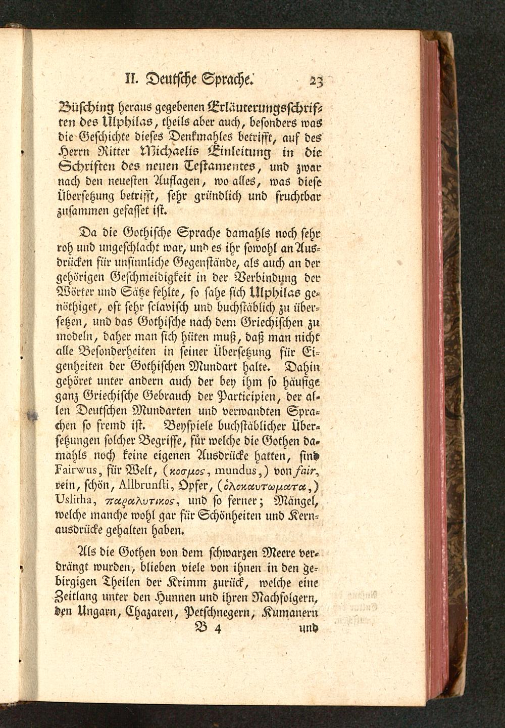 BüschmI heraus gegebenen Erlämerungsschrif--ren des Ulphilas , theils aber auch, besonders waSdie Geschichte dieses Denkmahles betrifft, auf desHerrn Ritter Michaelis EinleminI in dieSchriften des neuen Testamentes, und zwarnach den neuesten Auflagen, wo alles, was dieseÜbersetzung betrifft, sehr gründlich und fruchtbarZusammen gefasset ist.