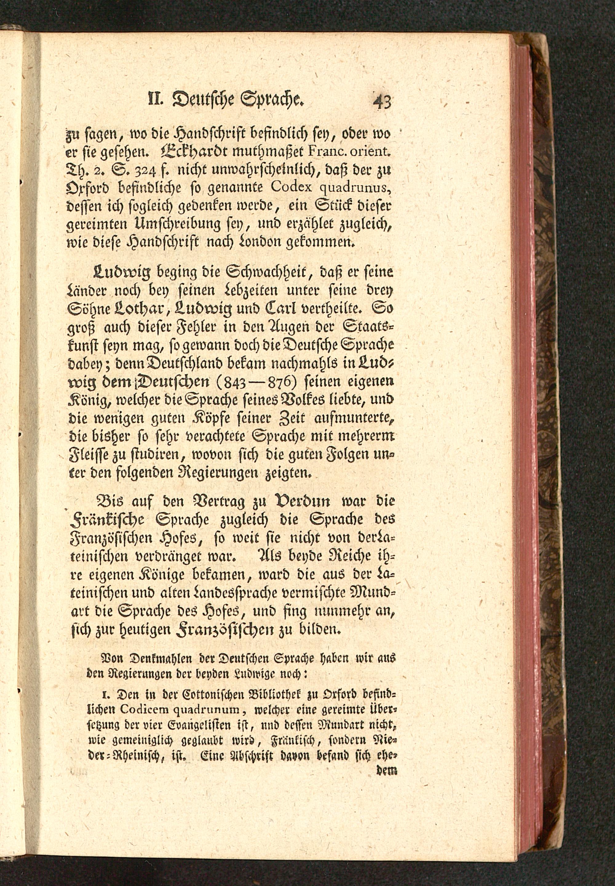 Ludwig beging die Schwachheit, daß er seineLänder noch bey seinen Lebzeiten unter seine dreySöhne Lothar, Ludwig und Carl vertheilte. Sogroß auch dieser Fehler in den Augen der Staats-kunst seyn mag, so gewann doch die Deutsche Sprachedabey; denn Deutschland bekam nachmahls in Lud-wig dem Deutschen (84? — 876) seinen eigenenKönig, welcher die Sprache seines Volkes liebte, unddie wenigen guten Köpfe seiner Zeit aufmunterte,die bisher so sehr verachtete Sprache mit mehrermFleisse zu studiren, wovon sich die guten Folgen un-ter den folgenden Regierungen zeigten.