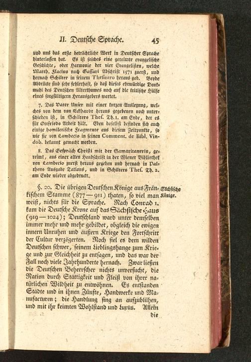 §. 20. Die übrigen Deutschen Könige aus Frän-S!ichsischpkischem Stamme (877—9") thaten, so viel man Könige,weis?, nichts für die Sprache. Nach Conrad i.kam die Deutsche Krone auf das Sächsische Haus(919 —1024); Deutschland ward unter demselbenimmer mehr und mehr gebildet, obgleich die ewigeninnern Unruhen und äußern Kriege den Fortschrittder Cultur verzögerten. Noch fiel es dem wildenDeutschen schwer, seinem iieblingöhange zum Krie-ge und zur Gleichheit zu entsagen, und das war derFall noch viele Jahrhunderte hernach. Zwar ließendie Deutschen Beherrscher nichts unversucht, dieNation durch Stattigkeit und Fleiß von ihrer na-türlichen Wildheit zu entwöhnen. Es entstandenStädte und in ihnen Zünfte, Handwerke und Ma-nufacturen; die Handlung fing an aufzublühen,und mit ihr keimten Wohlstand und juxuS. Allein
