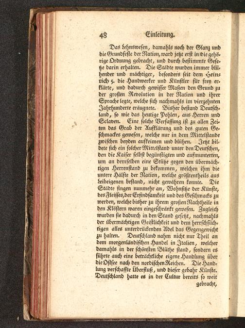 Das jehnswesen, damahls noch der Glanz unddie Grundfeste der Nation, ward jetzt erst in idie gehö-rige Ordnung gebracht, und durch bestimmte Gese-tze darin erhalten. Die Städte wurden immer blü-hender und mächtiger, besonders seit dem Heinsrich 5. die Handwerker und Künstler für frey er-klärte, und dadurch gewisser Maßen den Grund zuder großen Revolution in der Nation und ihrerSprache legte, welche sich nachmahls iin vierzehntenJahrhunderte eräugnete. Bisher bestand Deutsch-land , so wie das heutige Pohlen, aus Herren undSclaven. Eine solche Verfassung ist zu allen Zei-ten das Grab der Aufklärung und des guten Ge-schmackes gewesen, welche nur in dem Mittelstandezwischen beyden aufkeimen und blühen. Jetzt bil-dete sich ein solcher Mittelstand unter dcnDeutschen,den die Kaiser selbst begünstigten und aufmunterten,um an demselben eine Stütze gegen den übermäch-tigen Herrenstand zu bekommen, welchen ihm dieuntere Hälfte der Nation, welche größtentheils ausLeibeigenen bestand, nicht gewähren konnte. DieStädte fingen nunmehr an, Wohnsitze der Künste,des Fleisses,der Erfindsamkeit und des Geschmacks zuwerden, welche bisher zu ihrem großen Nachtheile inden Klöstern waren eingeschränkt gewesen. Zugleichwurden sie dadurch in den Stand gesetzt, nachmahlsder übermächtigen Geistlichkeit und dem herrschsüch-tigen alles unterdrückenden Adel das Gegengewichtzu halten. Deutschland nahm nicht nur Theil andem morgenländischen Handel in Italien , welcherdamahls in der schönsten Blüthe stand, sondern esführte auch eine beträchtliche eigene Handlung überdie Ostsee nach den nordischen Reichen. Die Hand-lung verschaffte Überfluß, und dieser gebahr Künste.Deutschland hatte eö in der Cultur bereits so weit