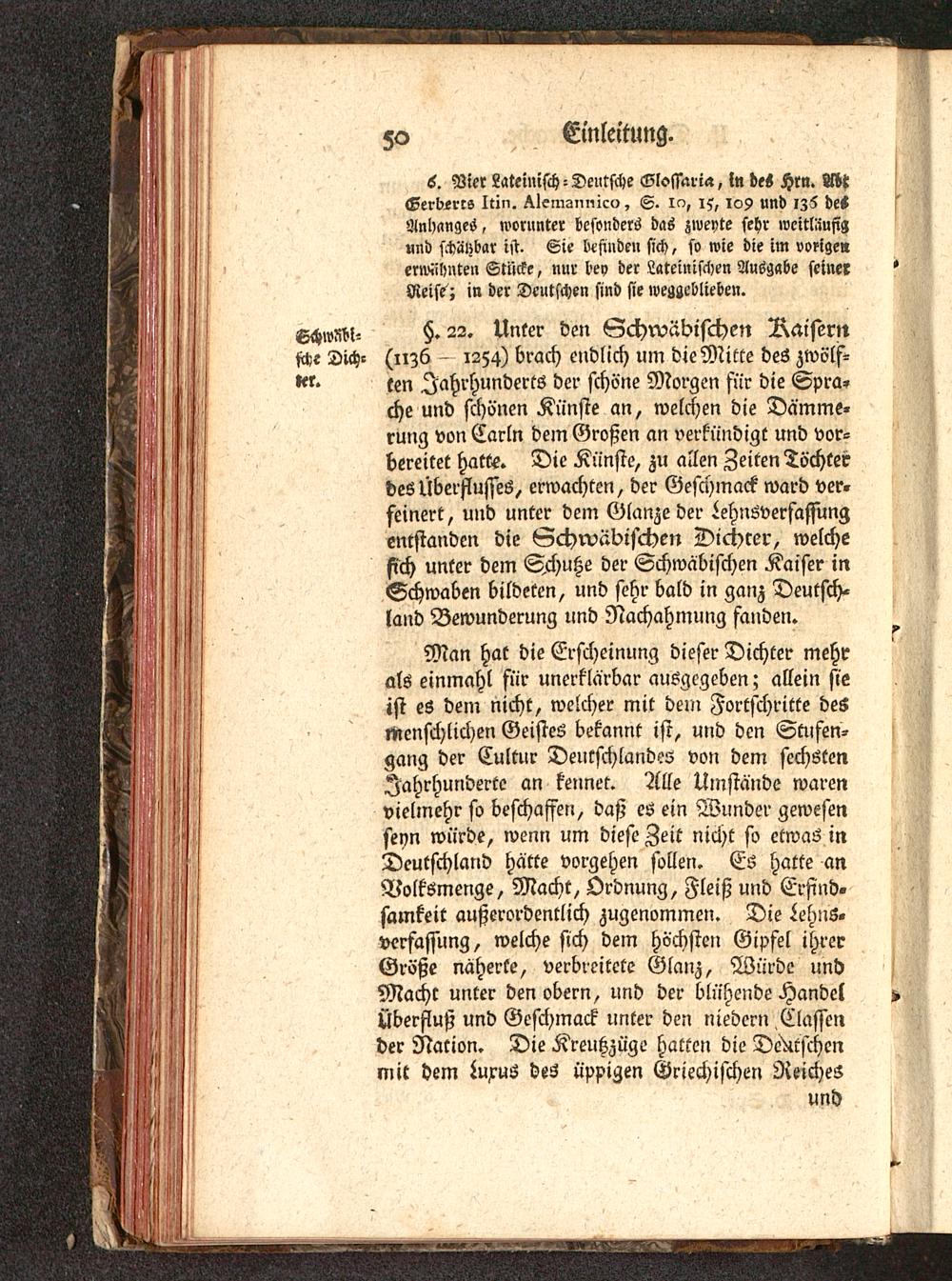 Man hat die Erscheinung dieser Dichter mehrals einmahl für unerklärbar ausgegeben; allein sieist es dem nicht, welcher mit dem Fortschritte desmenschlichen Geistes bekannt ist, und den Stufen-gang der Cultur Deutschlandes von dem sechstenJahrhundertc an kennet. Alle Umstände warenvielmehr so beschaffen, daß es ein Wunder gewesenseyn würde, wenn um diese Zeit nicht so etwas inDeutschland hätte vorgehen sollen. Es hatte anVolksmenge, Macht, Ordnung, Fleiß und Erfind,samkeit außerordentlich zugenommen. Die Lehns.Verfassung, welche sich dem höchsten Gipfel ihrerGröße näherte, verbreitete Glanz, Würde undMacht unter den obern, und der blühende HandelÜberfluß und Gefchmack unter den niedern Classender Nation. Die Kreulzzüge hatten die Deutschenmit dem Luxus des üppigen Griechischen Reiches