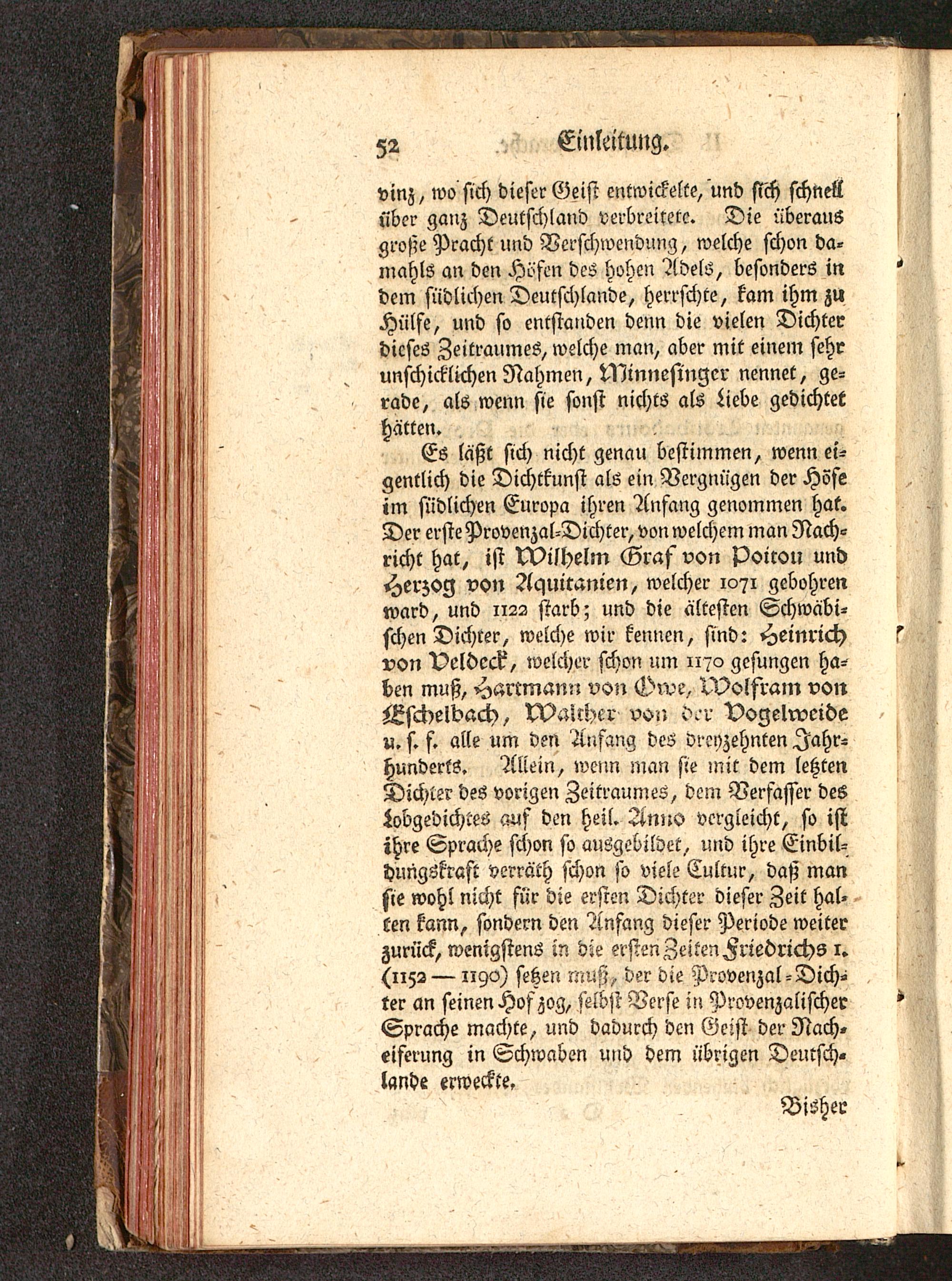 Es laßt sich nicht genau bestimmen, wenn ei-gentlich die Dichtkunst als ein Vergnügen der Höfeim südlichen Europa ihren Anfang genommen hat.Der erste Provenzal-Dichter, von welchem man Nach-richt hat, ist XVilhelm Graf von poirou undHerzog von Aquitanien, welcher 1071 gcbohrenward, und 1122 starb; und die ältesten Schwäbi-schen Dichter, welche wir kennen, sind: Heinrichvon Veldeck, welcher schon um 1170 gesungen ha-ben muß, Hartmanü von Owe, TVolfram vonAscdeldach, NXUlhcr von cvr Vogelrvcideu. s. f. alle um den Anfang des dreyzehnten Jahr-hunderts. Aliein, wenn man sie mit dem letztenDickte? des vorigen Zeitraumes, dem Verfasser desjobgevichtes auf den heil. Anno vergleicht, so istihre Sprache schon so ausgebildet, und ihre Einbil-dungskraft verräth schon so viele Cultur, daß mansie wohl nicht für die ersten Dichter dieser Zeit hat-ten kann, sondern den Anfang dieser Periode weiterzurück, wenigstens in die ersten Zeiten Friedrichs 1.(1152 —1190) setzen muß, der die Provenzal-Dich-ter an seinen Hofzog, selbst Verse in ProvenzalischerSprache machte, und dadurch den Geist der Nach»eiferung in Schwaben und dem übrigen Deutsch-lands erweckte,