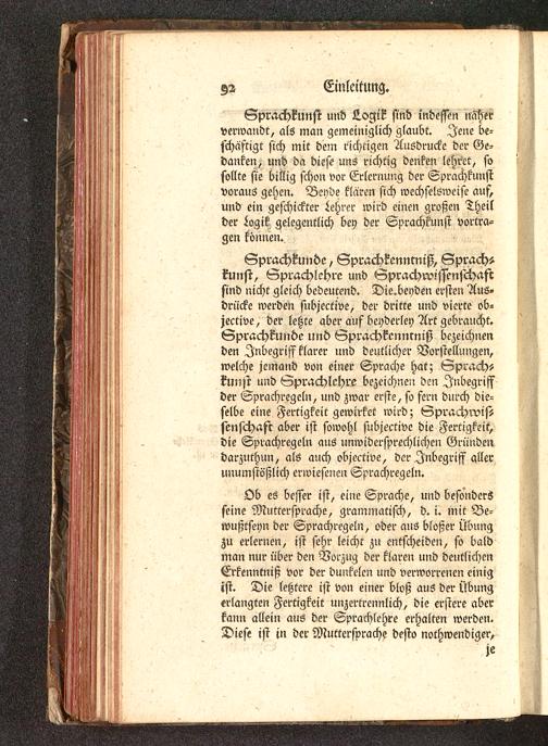 Ob es besser ist, eine Sprache, und besondersseine Muttersprache, grammatisch, d. i. mit Be-wußtseyn der Sprachregeln, oder aus bloßer Übungzu erlernen, ist sehr leicht zu entscheiden, so baldman nur über den Vorzug der klaren und deutlichenErkenntniß vor der dunkelen und verworrenen einigist. Die lehtere ist von einer bloß aus der Übungerlangten Fertigkeit unzertrennlich, die erstere aberkann allein aus der Sprachlehre erhalten werden.Diese ist in der Muttersprache desto nothwendiger,