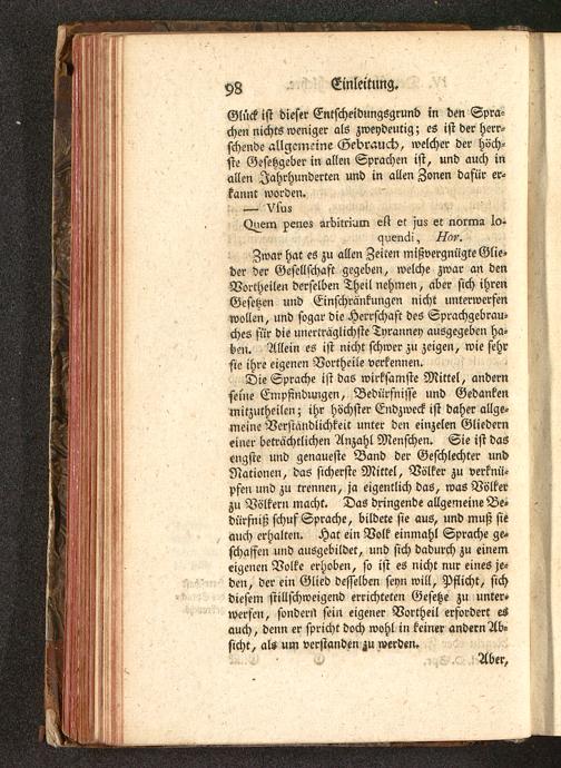 Die Sprache ist das wirksamste Mittel, andernseine Empfindungen, Bedürfnisse und Gedankenmitzutheilen; ihr höchster Endzweck ist daher allge-meine Verständlichkeit unter den einzelen Gliederneiner beträchtlichen Anzahl Menschen. Sie ist dasengste und genaueste Band der Geschlechter undNationen, das sicherste Mittel, Völker zu verknü-pfen und zu trennen, ja eigentlich das, was Völkerzu Völkern macht. Das dringende allgemeine Be»dürfniß schuf Sprache, bildete sie aus, und muß sieauch erhalten. Hat ein Volk einmahl Sprache ge-schaffen und ausgebildet, und sich dadurch zu einemeigenen Volke erhoben, so ist es nicht nur eines je-den, der ein Glied desselben seyn will, Pflicht, sichdiesem stillschweigend errichteten Gesetze zu unter»werfen, sondert sein eigener Vortheil erfordert esauch, denn er spricht doch wohl in keiner andern Ab-sicht, als um verstanden werden.