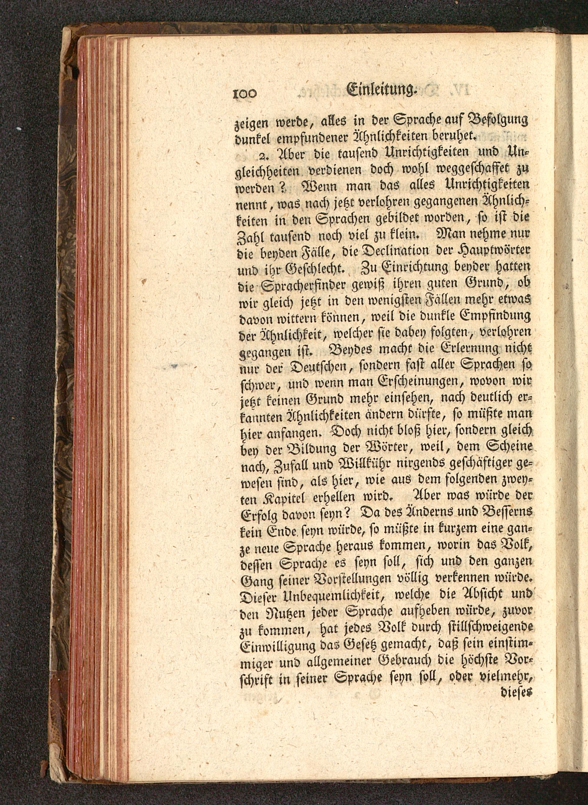 2. Aber die taufend Unrichtigkeiten und Un-gleichheiten verdienen doch wohl weggeschaffet zuwerden? Wenn man das alles Unrichtigkeitennennt. was nach jetzt verlohren gegangenen Ähnlich-keiten in den Sprachen gebildet worden , so ist dieZahl tausend noch viel zu klein. Man nehme nurdie beyden Falle, die Declination der Hauptwörterund ihr Geschlecht. Zu Einrichtung beyder hattendie Spracherfinder gewiß ihren guten Grund, obwir gleich jetzt in den wenigsten Fällen mehr etwasdavon wittern können, weil die dunkle Empfindungder Ähnlichkeit, welcher sie dabey folgten , verlohrengegangen ist. Beydes macht die Erlernung nichtnur der Deutschen, sondern fast aller Sprachen soschwer, und wenn man Erscheinungen, wovon wirjetzt keinen Grund mehr einsehen, nach deutlich er-kannten Ähnlichkeiten andern dürfte, so müßte manhier anfangen. Doch nicht bloß hier, sondern gleichbey der Bildung der Wörter, weil, dem Scheinenach, Zufall und Willkühr nirgends geschäftiger ge-wesen sind, als hier, wie aus dem folgenden zwey-ten Kapitel erhellen wird. Aber was würde derErfolg davon seyn? Da des ÄndernS und Bessernskein Ende, seyn würde, so müßte in kurzem eine gan-ze neue Sprache heraus kommen, worin das Volk,besten Sprache es seyn soll, sich und den ganzenGang seiner Vorstellungen völlig verkennen würde.Dieser Unbequemlichkeit, welche die Absicht undden Nutzen jeder Sprache aufheben würde, zuvorzu kommen, hat jedes Volk durch stillschweigendeEinwilligung das Gesetz gemacht, daß sein einstim-miger und allgemeiner Gebrauch die höchste Vor-schrift in seiner Sprache seyn soll, oder vielmehr,