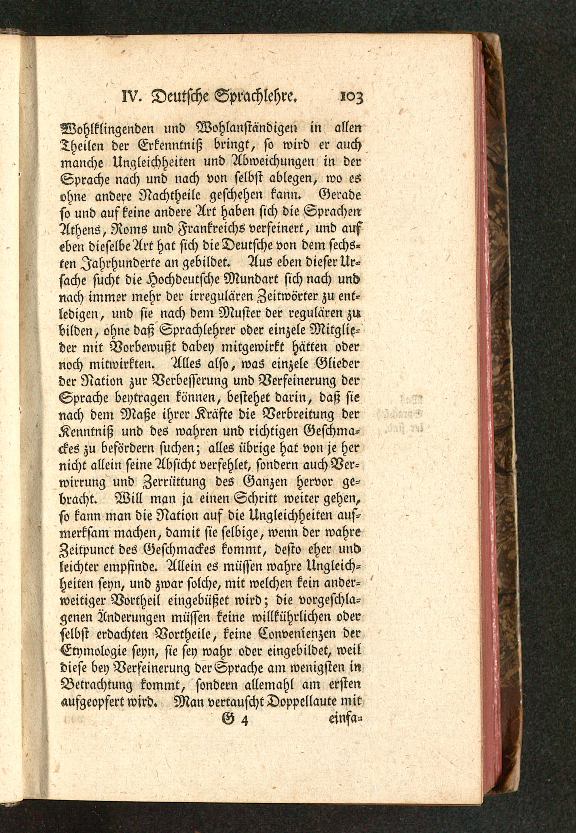 Wohlklingenden und Wohlanständigen in allenTheilen der Erkenntniß bringt, so wird er auchmanche Ungleichheiten und Abweichungen in derSprache nach und nach von selbst ablegen, wo esohne andere Nachtheile geschehen kann. Geradeso und aufkeine andere Art haben sich die SprachenAthens, Roms und Frankreichs verfeinert, und aufeben dieselbe Art hat sich die Deutsche von dem sechs,ten Jahrhunderte an gebildet. Aus eben dieser Ur-sache sucht die Hochdeutsche Mundart sich nach undnach immer mehr der irregulären Zeitwörter zu ent-ledigen, und sie nach dein Muster der regulären zu»bilden, ohne daß Sprachlehrer oder einzele Mitglie-der mit Vorbewußt dabey mitgewirkt hätten odernoch mitwirkten. Alles also, was einzele Gliederder Nation zur Verbesserung und Verfeinerung derSprache beytragen können, bestehet darin, daß sienach dem Maße ihrer Kräfte die Verbreitung derKenntniß und des wahren und richtigen Geschma-ckes zu befördern suchen; alles übrige hat von je hernicht allein seine Absicht verfehlet, sondern auch Ver-wirrung und Zerrüttung des Ganzen hervor ge-bracht. Will man ja einen Schritt weiter gehen,so kann man die Nation auf die Ungleichheiten auf-merksam machen, damit sie selbige, wenn der wahreZeitpunct des Geschmackes kommt, desto eher undleichter empfinde. Allein es müssen wahre Ungleich-heiten seyn, und zwar solche, mit welchen kein ander-weitiger Vortheil eingebüßet wird; die vorgeschla-genen Änderungen müssen keine willkührlichen oderselbst erdachten Vortheile, keine Convenienzen derEtymologie seyn, sie sey wahr oder eingebildet, weildiese bey Verfeinerung der Sprache am wenigsten inBetrachtung kommt, sondern allemahl am erstenaufgeopfert wird. Man vertauscht Doppellaute mit