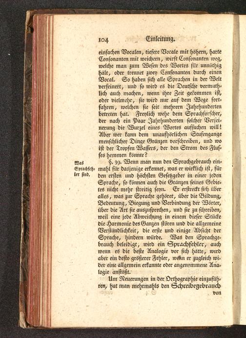 einfachen Vocalen, tiefere Vocale mit höhern, harteConsonanten mit weichern, wirft Confonanten weg,welche man zum Wesen des Wortes für unnöthighält, oder trennet zwey Consonanten durch einenVocal. So haben sich alle Sprachen in der Weltverfeinert, und so wird es die Deutsche vermuth-lich auch machen, wenn ihre Zeit gekommen ist,oder vielmehr, sie wird nur auf dem Wege fort-fahren, welchen sie seit mehrern Jahrhundertenbetreten hat. Freylich wehe dem Sprachforscher,der nach ein Paar Jahrhunderten solcher Verfei-nerung die Wurzel eines Wortes aufsuchen will!Aber wer kann dem unaufhörlichen Stufengangemenschlicher Dinge Gränzen vorschreiben, und woist der Tropfen Wassers, der den Strom des Flus-ses hemmen könnte?Was §. Z9« Wenn man nun den Sprachgebrauch ein-