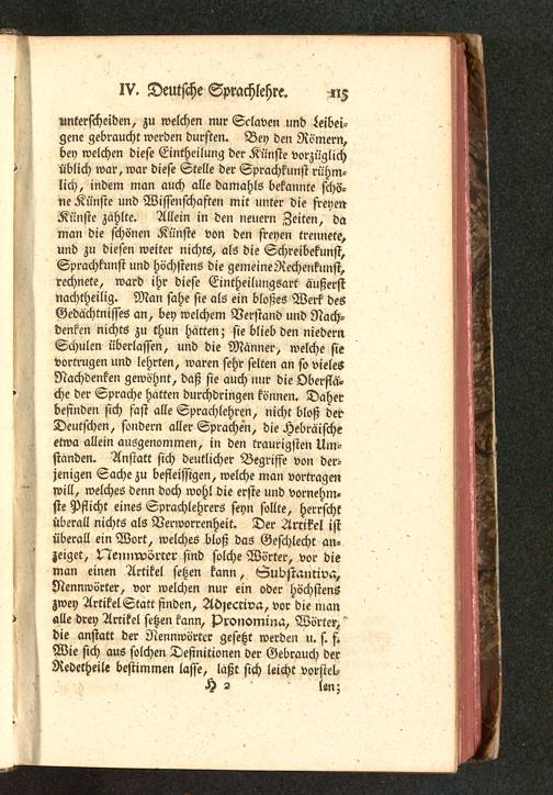 unterscheiden, zu welchen nur Sclaven und Leibei-gene gebraucht werden dursten. Bey den Römern,bey welchen diese Eintheilung der Künste vorzüglichüblich war, war diese Stelle der Sprachkunst rühm-lich, indem man auch alle damahls bekannte schö-ne Künste und Wissenschaften mit unter die freyen-Künste zahlte. Allein in den neuern Zeiten, daman die schönen Künste von den freyen trennete,und zu diesen weiter nichts, als die Schreibekunst,Sprachkunst und höchstens die gemeineRechenkunst,rechnete, ward ihr diese EintheilungSart äußerstnachtheilig. Man sahe sie als ein bloßes Werk deöGedächtnisses an, bey welchem Verstand und Nach-denken nichts zu thun Härten; sie blieb den niedernSchulen überlassen, und die Männer, welche sievortrugen und lehrten, waren sehr selten an so vielesNachdenken gewöhnt, daß sie auch nur die Oberflä-che der Sprache hatten durchdringen können. Daherbefinden sich fast alle Sprachlehren, nicht bloß derDeutschen, sondern aller Sprachen, die Hebräischeetwa allein ausgenommen, in den traurigsten Um-ständen. Anstatt sich deutlicher Begriffe von der-jenigen Sache zu befleissigen, welche man vortragenwill, welches denn doch wohl die erste und vornehm-ste Pflicht eines Sprachlehrers seyn sollte, herrschtüberall nichts als Verworrenheit. Der Artikel istüberall ein Wort, welches bloß das Geschlecht an-zeiget, ^ennrvörter sind solche Wörter, vor dieman einen Artikel sehen kann, Suojtanriva,Nennwörter, vor welchen nur ein oder höchstenszwey Artikel Statt finden, Adjectiva, vor die manalle drey Arrikel setzen kann, Pronomina, Wörter,die anstatt der Nennwörter gesetzt werden u. s. f.Wie sich aus solchen Definitionen der Gebrauch derRedetheile bestimmen lasse, läßt sich leicht vorstel-