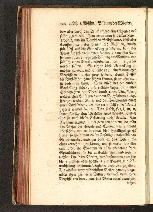 dere aber durch den Druck irgend eines Theiles des-selben , gebildet. Jene nennt man seit alten ZeitenVocale, und im Deutschen Selbstlaute, diese aberConfonanten oder Mitlaute; Nahmen, welchesich bloß auf die Bemerkung gründeten, daß jederVocal für sich allein tönen konnte, die meisten Con-sonanten aber eine gewiffe Öffnung des Mundes, undfolglich einen Vocal, erforderten, wenn sie hörbarwerden sollten. So richtig diese Bemerkung anund für sich war, und so leicht sie zu einem deutlichenBegriffe von diesen zwey so verschiedenen Classender Buchstaben hätte führen können, so benutzte mansie doch nicht dazu. Man blieb bey der dunkelnVorstellung stehen, und erklärte daher fast in allenSprachlehren den Vocal durch einen Buchstaben,welcher ohne Hülfe eines andern Buchstabens ausge-sprochen werden könne, und den Confonanten durcheinen Buchstaben, der nur vermittelst eines Vocalsgehöret werden könne. Das f sch, f, r, l, in, u,lauten für sich ohne Beyhülfe eines Vocals, folglichsind sie nach dieser Erklärung auch Vocale. EinIrrthum erzeugt immer gern den andern; da mandas Wesen der Vocale und Confonanten einmahlübersehen, und es in etwas bloß Zufälliges gefetzthatte, so hielt man dieses Zufällige, nähmlich dasSelbsttönende, auch gar bald sür das Wesentliche-eines vernehmlichen jauteS, und so wurden die Vo-cale wider ihr Erwarten in allen abendländischenSprachlehren für die ausdrückendsten und wesent.lichsten Theile der Wörter, die Confonanten aber fürbloße müßige oder höchstens Zur Parade und Ab-wechselung bestimmte Begleiter derselben gehalten.Die älteste«? morgenländischen Völker hatten, unge-achtet ihrer geringern Cultur, dennoch deutlichereBegriffe von dem, was das Wesen eines vernehm-lichen