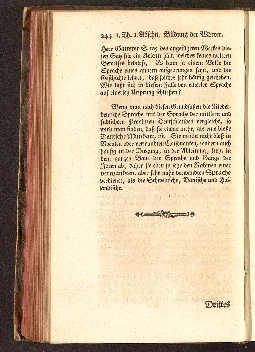 Wenn man nach diesen Grundsätzen die Nieder-deutsche Sprache mit der Sprache der mittlern undsüdlichern Provinzen Deutschlandes vergleicht, sowird man finden, daß sie etwas mehr, als eine bloßeDeutsche iVundarr, ist. Sie weicht nicht bloß inVocalen oder verwandten Consonanten, sondern auchhäufig in der Biegung, in der Ableitung, kurz, indem ganzen Baue der Sprache und Gange derIdeen ab, daher sie eben so sehr den Nahmen einerverwandten, aber sehr nahe verwandten Spracheverdienet, als die Schwedische, Dänische und Hol-ländische.