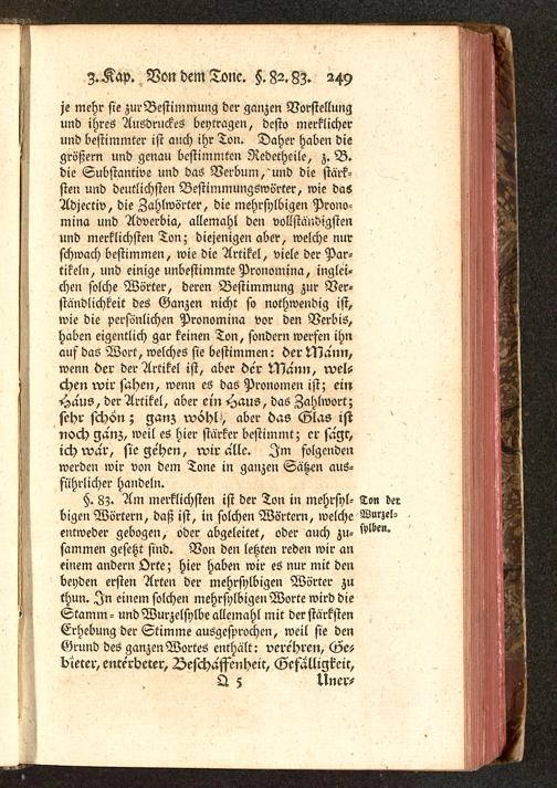 §. 8Z. Am merklichsten ist der Ton in mehrsyl- Ton derbigen Wörtern, daß ist, in solchen Wörtern, welche Wurzel-entweder gebogen, oder abgeleitet, oder auch zu- ^lben«sammen gesetzt sind. Von den letzten reden wir aneinem andern Orte; hier haben wir es nur mit denbeyden ersten Arten der mehrsylbigen Wörter zuthun. In einem solchen mehrsilbigen Worte wird dieStamm - und Wurzelsilbe allemahl mit der stärkstenErhebung der Stimme ausgesprochen, weil sie denGrund des ganzen Wortes enthält: verehren, Ge?bieter, emerbtter, Beschaffenheit, Gefälligkeit,