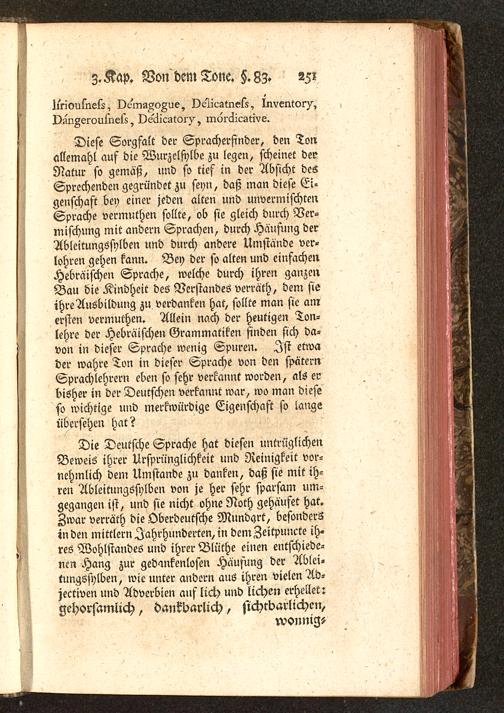 Diese Sorgfalt der Sprachersinder, den Tonallemahl auf die Wurzelfylbe zu legen, scheinet derNatur so gemäß, und so tief in der Absicht desSprechenden gegründet zu seyn, daß man diese Ei-genschaft bey einer jeden alten und unvermischtenSprache vermuthen sollte, ob sie gleich durch Ver-mischung mit andern Sprachen, durch Häufung derAbleitungssylben und durch andere Umstände ver-lohren gehen kann. Bey der so alten und einfachenHebräischen Sprache, welche durch ihren ganzenBau die Kindheit des Verstandes verräth, dem sieihre Ausbildung zu verdanken hat, sollte man sie amersten vermuthen. Allein nach der heutigen Ton-lehre der Hebräischen Grammatiken finden sich da-von in dieser Sprache wenig Spuren. Ist etwader wahre Ton in dieser Sprache von den späternSprachlehrern eben so sehr verkannt worden, als erbisher in der Deutschen verkannt war, wo man dieseso wichtige und merkwürdige Eigenschaft so langeübersehen hat?