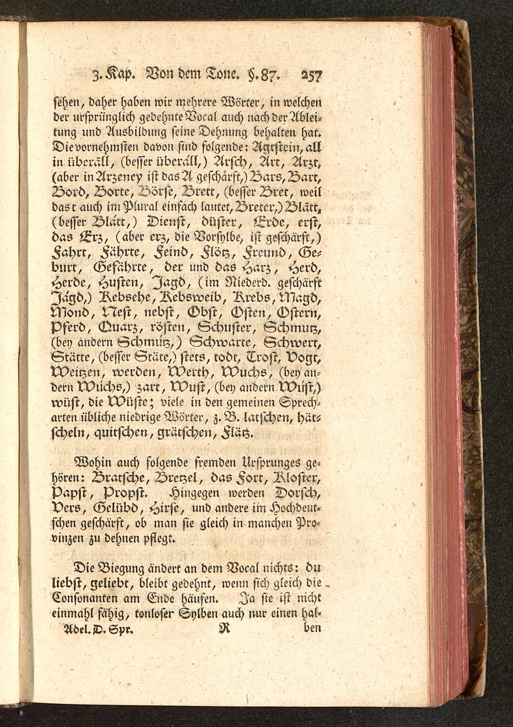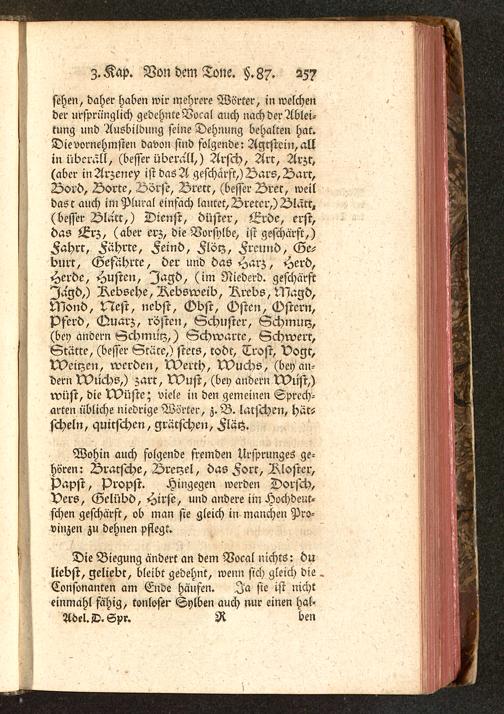 sehen, daher haben wir mehrere Wörter, in welchender ursprünglich gedehnte Vocal auch nach der Ablei-tung und Ausbildung seine Dehnung behalten hat.Dievornehmsien davon sind folgende: Agrstcin,allin überall, (besser überall,) Arsch, Art, Arzt,(aber in Arzeney ist das A geschärft,) Bars, Bart,Bord, Borte, Börse, Brett, (besser Brer, weildas r auch im Plural einfach lautet, Bretcr,) Blatt,(besser Blatt,) Dienst, düster, Erde, erst,das jLrz, (aber erz, die Vorsilbe, ist geschärft,)Fahrt, Fährte, Feind, FlörZ, Freund, Ge-burt, Gefährte, der und das Harz, Herd,Herde, Husten, Jagd, (im Niederd. geschärftJagd,) Aebsehe, Aebsweib, V.rebs,Magd,Mond, Nest, nebst, Obst, Osten, Ostern,Pferd, Ouarz, rösten, Schuster, Schmurz,(bey andern Schmurz,) Schwarte, Schwert,Stätte, (besser Stäcc,) stets, todt, Trost, Vogt,XVeirzen, werden, Merth, XVuchs, (bey an-dern N)uchs,) zart, lVust, (bey andern N>üst,)wüst, die TVüste; viele in den gemeinen Sprcch-arten übliche niedrige Wörter, z.B. latschen, hät-scheln, quitschen, grätschen, Flärz.