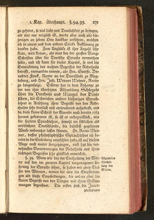 §. 95. Wenn wir bey der Eintheiluug derWör- Allgemeineter auf den im zweyten Kapitel vorgetragenen Ur- Emrhei-sprung der Sprache sehen, so haben wir zwey Clas-sen von Wörtern, wovon die eine die Empfindun-gen als bloße Empfindungen, die andere aber dieklaren Begriffe von den Dingen und ihren Besinn-mungen bezeichnet. Die ersten sind die Inter -