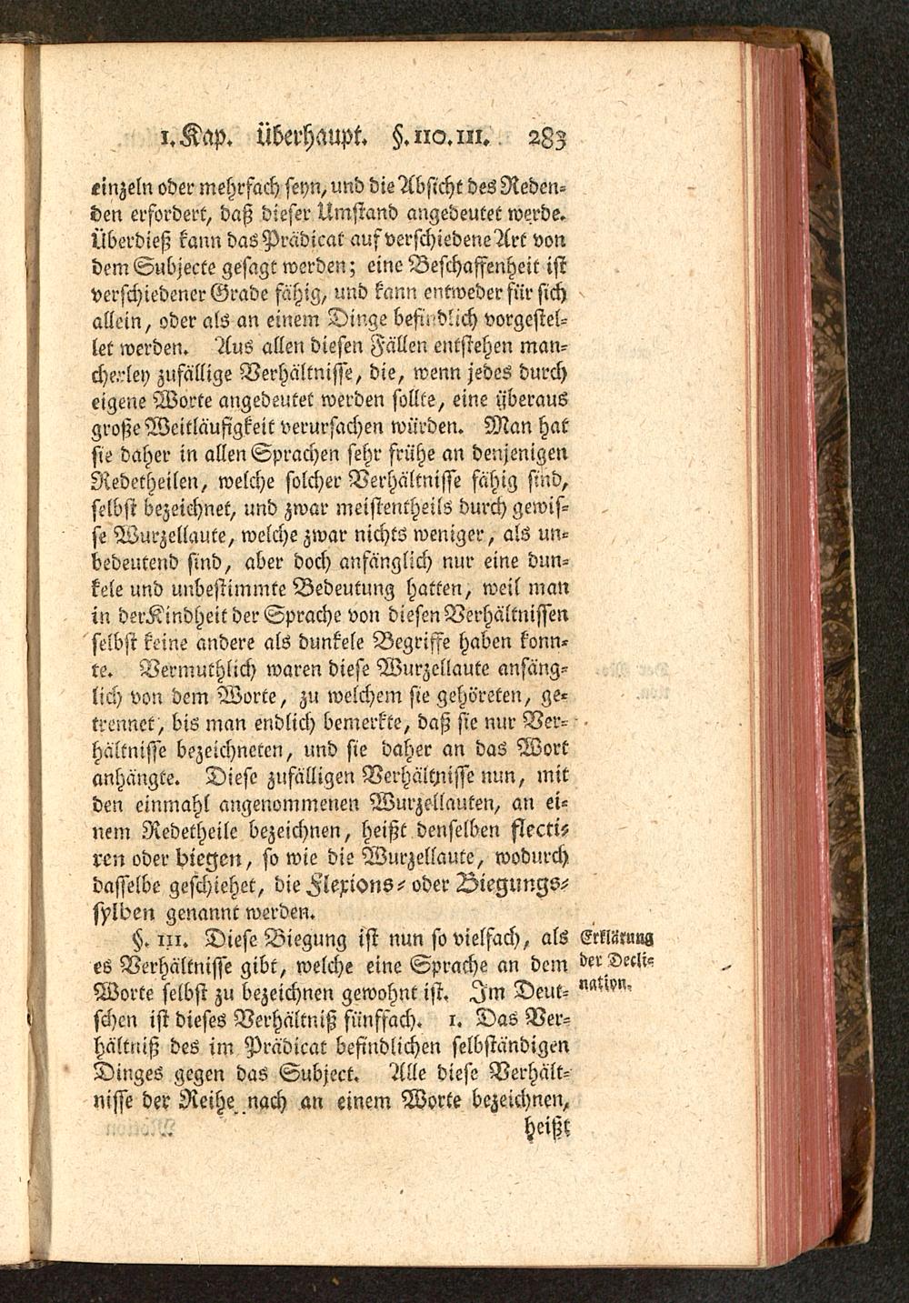 §. 111. Diese Biegung ist nun so vielfach, als Erkliikuuges Verhältnisse gibt, welche eine Sprache an dem der Decli-Worte selbst zu bezeichnen gewohnt ist. Im Deut-sehen ist dieses Verhältniß fünffach. 1. Das Ver-hältniß des im Prädicat befindlichen selbständigenDinges gegen das Subject. Alle diese Verhält-nisse der Reihe nach an einem Worte bezeichnen,
