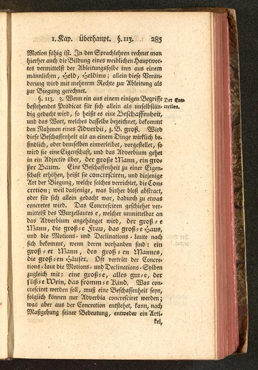 §. 11z. z. Wenn ein aus einem einigen Begriffe Der So«,bestehendes Prädicat für sich allein als unselbstän- cretien.dig gedacht wird, so heißt es eine Beschaffenheit,und das Wo-rt, welches dasselbe bezeichnet, bekommtden Nahmen eines Adverbii, z.B. groß. Wirddiese Beschaffenheit als an einem Dinge wirklich be.findlich, oder demselben einverleibet, vorgestellet, sowird sie eine Eigenschaft, und das Adverbium gehetin ein Adjectiv über, der große Mann, ein gro?ßer Baum. Eine Beschaffenheit zu einer Eigen,schaft erhöhen, heißt sie concresciren, und diejenigeArt der Biegung, welche solches verrichtet, dieCon-cretion; weil dasjenige, was bisher bloß abstract,oder für sich allein gedacht war, dadurch zu etwasconcreteS wird. Das Concrefciren geschiehet ver-mittelst des Wurzellautes e, welcher unmittelbar andas Adverbium angehänget wird, der groß - eMann, die groß-e Frau, das groß-e Haus,und die Motions-und Declinations - Laute nachsich bekommt, wenn deren vorhanden sind: eingroß - er Mann, des groß - en Mannes,die groß - en Häuser. Oft vertritt der Concre-tions-Laut die Motions- undDeclinations-Sylb?nzugleich mit; eine groß-e, alles gut-e, dersüß - e H?ein, das fromm 5 e Aind. Was con-cresciret werden soll, muß eine Beschaffenheit seyn,folglich können nur Adverbia concrefciret werden;was aber aus der Concretion entstehet, kann, nachMaßgebung seiner Bedeutung, entweder einArti«