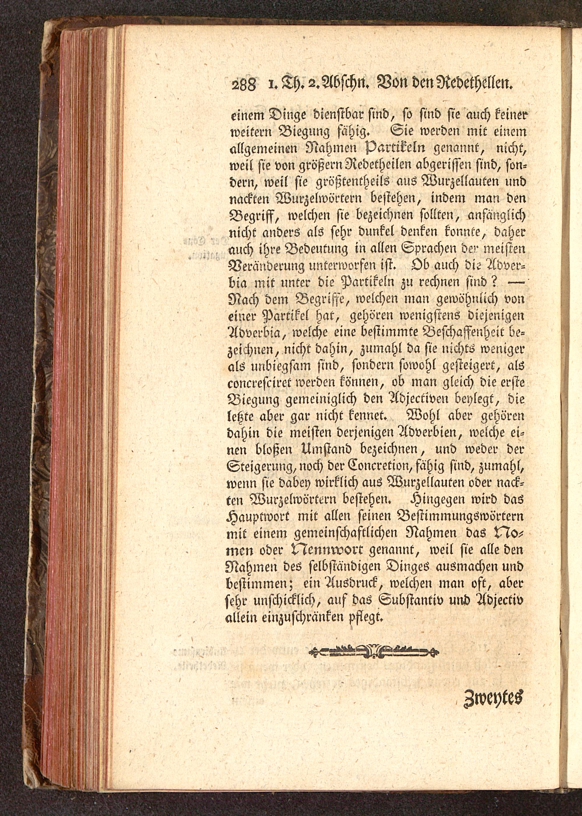 einem Dinge dienstbar sind, so sind sie auch keinerweitem Biegung fähig. Sie werden mit einemallgemeinen Nahmen Partikeln genannt, nicht,weil sie von größern Redetheilen abgerissen sind, son-dern, weil sie größtentheils aus Wurzellauten lindnackten Wurzelwörtern bestehen, indem man denBegriff, welchen sie bezeichnen sollten, ansanglichnicht anders als sehr dunkel denken konnte, daherauch ihre Bedeutung in allen Sprachen der meistenVeränderung unterworfen ist. Ob auch die Adver-bia mit unter die Partikeln zu rechnen sind? —Nach dem Begriffe, welchen man gewöhnlich voneiner Partikel hat, gehören wenigstens diejenigenAdverbia, welche eine bestimmte Beschaffenheit be-zeichnen, nicht dahin, zumahl da sie nichts wenigerals unbiegsam sind, sondern sowohl gesteigert, alsconcresrirct werden können, ob man gleich die ersteBiegung gemeiniglich den Adjectiven beylegt, dieletzte aber gar nicht kennet. Wohl aber gehörendahin die meisten derjenigen Adverbien, welche ei-nen bloßen Umstand bezeichnen, und weder derSteigerung, noch der Concretion, fähig sind, zumahl,wenn sie dabey wirklich aus Wurzellauten oder nack-ten Wurzelwörtern bestehen. Hingegen wird dasHauptwort mit allen seinen Bestimmungswörternmit einem gemeinschaftlichen Nahmen das do-rnen oder Nennwort genannt, weil sie alle denNahmen des selbständigen Dinges ausmachen undbestimmen; ein Ausdruck, welchen man oft, abersehr unschicklich, auf das Substantiv und Adjectiv allein einzuschränken pflegt.