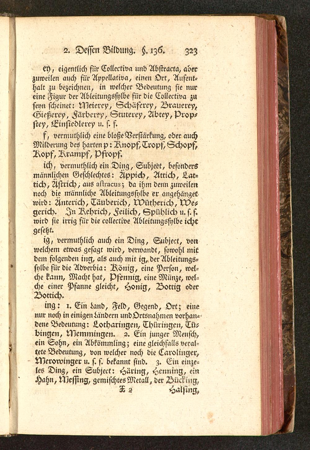 ich, vermuthlich ein Ding, Subject, besondersmännlichen Geschlechtes: Äppich, Attich, Lat-tich, Äftrich, aus aürgcux; da ihm denn zuweilennoch die männliche Ableitungssylbe er angehängetwird: Ämcrich, Täuberich, Wütherich, We-gerich. In Nchrich, Leilich, Epühlich n. s. f.wird sie irrig für die collective Ableitungssylbe ichcgefetzt.