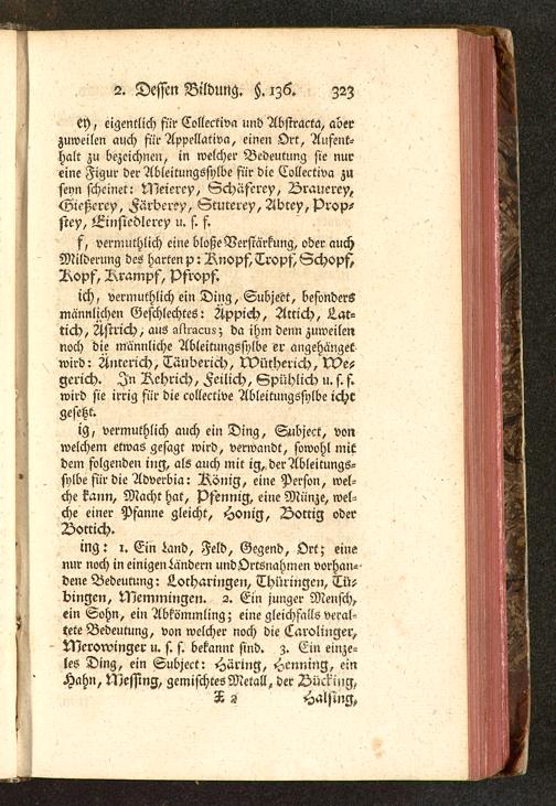 Mg: i. Ein Land, Feld, Gegend, Ort; einenur noch in einigen Ländern undOrtönahmen vorhan-dene Bedeutung: Lotharingen, Thüringen , Tü-dingen, Memmingen . 2. Ein junger Mensch,ein Sohn, ein Abkömmling; eine gleichfalls veral--tete Bedeutung, von welcher noch die Carolinger,Mcrowinger u. s. s. bekannt sind. z. Ein einze-les Ding, ein Subject: Häring, Henning, einHahn, Messing, gemischtes Metall, der Dücb'ing,