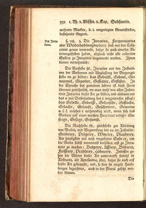 Der Jtera- §. iz8. Z. Die Iterariva, Frequentativativen. oder ^Viederhohlungswörrer sind mit den Colle-ctivs genau verwandt, daher sie auch einerley Ab-leitungssylben haben, obgleich nicht alle collectiveSylben zu Iterativis angewaudt werden. Ihnendienen vornehmlich:
