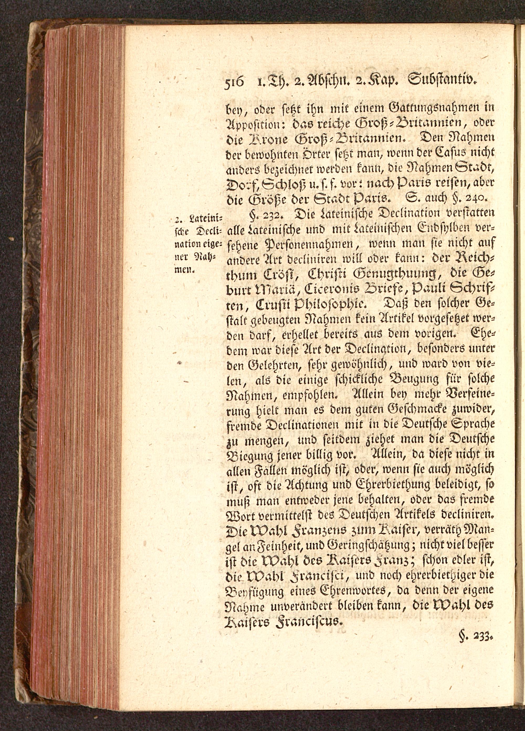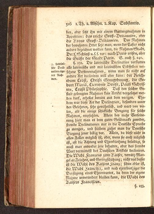 bey , oder setzt ihn mit einem Gattungsnahmen inApposition: das reiche Groß-L>ritannicn, »derdie Krone Groß-Vrirannien. Den Nahmender bewohnten Örter setzt man, wenn der Casus nichtanders bezeichnet werden kann, die Nahmen Gc^dt,Dorf, Schloß u. s. f. vor t nach Paris reift», aberdie Große der Stadt Paris . S. auch §. 240.5. Latcini- §' 2Z2. Die lateinische Declination verstattenscl?e Dccli- alle Lateinische und mit lateinischen Endsylben ver-narioncige^ sxs^ne Personennahmen, wenn man sie nicht aufncr Rah- Art decliniren will oder kann: der Reich-