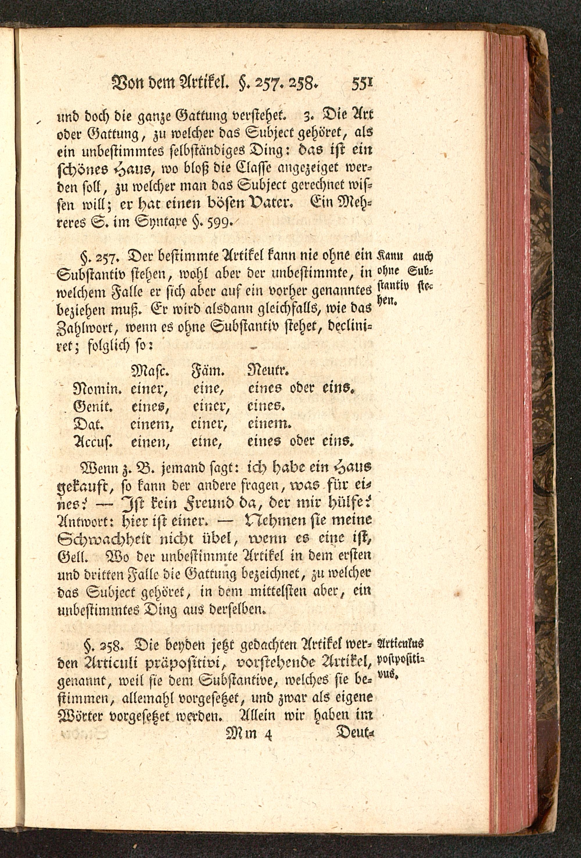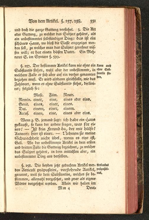 §. 258. Die beyden jetzt gedachten Artikel wer- Artimlusden Arriculi präpositivi, vorstehende Artikel, postpoMgenannt, weil sie dem Substantive, welches sie be-stimmen, allemahl vorgesetzet, und zwar als eigeneWörter vorgesetzet werden. Allein wir haben im