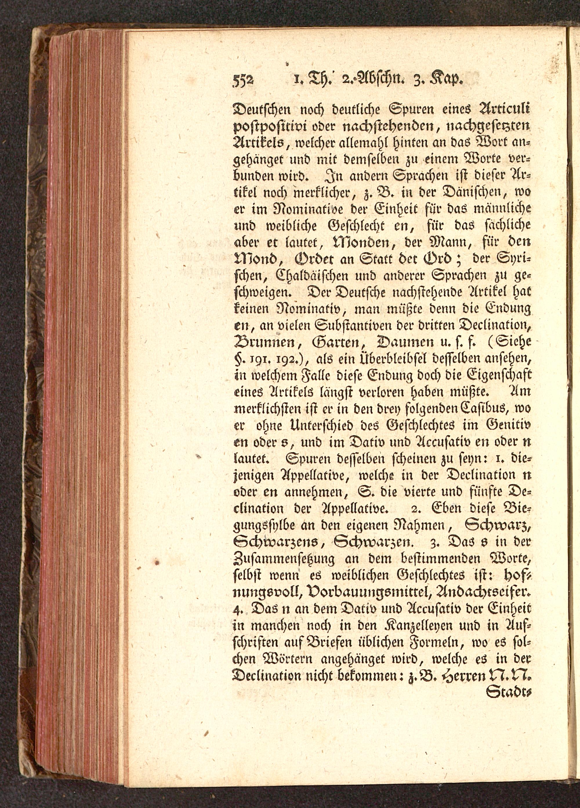 Deutschen noch deutliche Spuren eines Articulipostposittvl oder nachstehenden, nachgesetztenArtikels, welcher allemahl hinten an da6 Wort an-gehänget und mit demselben zu einem Worte ver-bunden wird. In andern Sprachen ist dieser Ar-tikel noch merklicher, z.B. in der Dänischen , woer im Nominative der Einheit für das männlicheund weibliche Geschlecht en, für das sachlicheaber et lautet, Monden, der Mann, für denMond, Order an Statt der Grd; der Syri-schen , Chaldäischen und anderer Sprachen zu ge-schweige». Der Deutsche nachstehende Artikel hatkeinen Nominativ, man müßte denn die Endungen, an vielen Substantiven der dritten Declination,Brunnen, Garten, Daumen u. s. f. (Siehe§. iyi. 192.), als ein Überbleibsel desselben ansehen,in welchem Falle diese Endung doch die Eigenschafteines Artikels längst verloren haben müßte. Ammerklichsten ist er in den drey folgenden Casibus, woer ohne Unterschied des Geschlechtes im Genitiven oder s, und im Dativ und Accusativ en oder nlautet. Spuren desselben scheinen zu seyn: 1. die-jenigen Appellative, welche in der Declination noder en annehmen, S. die vierte und fünfte De-clination der Appellative. 2. Eben diese Bie-gungsjylbe an den eigenen Nahmen, Schwarz,Schwarzens, Schwarzen, z. Das s in derZusammensetzung an dem bestimmenden Worte,selbst wenn es weiblichen Geschlechtes ist: Hof-nungevoll, VordauunIsmicrel, Andachtseifer.4. Das n an dem Dativ und Accusativ der Einheitin manchen noch in den Kanzelleyen und in Auf-schriften auf Briefen üblichen Formeln, wo es sol-chen Wörtern angehänget wird, welche es in derDeclination nicht bekommen: z.B. Herren^!.^7.