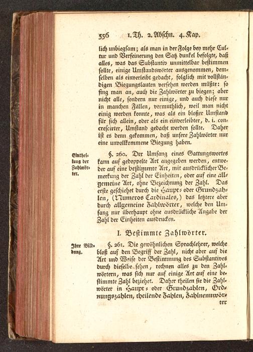 §. 260. Der Umfang eines GattungöworteSkann auf gedoppelte Art angegeben werden, entwe-der auf eine bestimmte Art, mit ausdrücklicher Be-merkung der Zahl der Einheiten, oder auf eine all-gemeine Art, ohne Bezeichnung der Zahl. Daserste geschiehet durch die <^aupt- oder Grundzah-len, (Numeros Cardmalcs,) das letztere aberdurch allgemeine Zahlwörter, welche den Um-fang nur überhaupt ohne ausdrückliche Angabe derZahl der Einheiten ausdrucken.