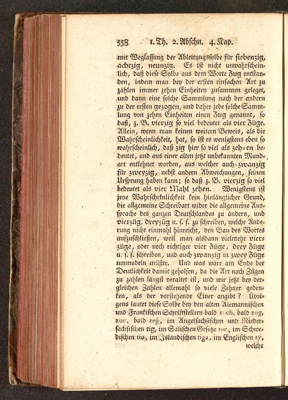 mit Weglassung der Ableitungssylbe für siedenzig,achtzig, neunzig. Es ist nicht unwahrschein-lich, daß diese Sylbe aus dein Worte Fug entstan-den, indem man bey der ersten einfachen Art zuzählen immer zehen Einheiten zusammen geleget,und dann eine solche Sammlung nach der andernzu der ersten gezogen, und daher jede solche Samm-lung von zehen Einheiten einen Fug genannt, sodaß, z. B. vierzig so viel bedeutet als vier Züge^Allein, wenn man keinen weitern Beweis, als dieWahrscheinlichkeit, hat, so ist es wenigstens eben sowahrscheinlich, daß zig hier soviel als zeh-en be-deutet, und aus einer alten jeht unbekannten Mund-ort entlehnet worden, aus welcher auch zwanzigfür Zweyzig, nebst andern Abweichungen, seinenUrsprung haben kann; so daß z. B. vierzig so vielbedeutet als vier Mahl zehen. Wenigstens istjene Wahrscheinlichkeit kein hinlänglicher Grund,die allgemeine Schreibart wider die allgemeine Aus-sprache des ganzen Dcutschlandes zu ändern, undvierzüg, dreyzüg u. s. f. zu schreiben, welche Ände-rung nicht einmahl hinreicht, den Bau des Wortesauszuschließen, weil man alsdann vielmehr vier--züge, oder noch richtiger vier Züge, drey Zügeu, s. f. schreiben, und auch zwanzig in zwey Fügeummodeln müßte. Und was wäre am Ende derDeutlichkeit damit geholfen, da die Art nach Zügenzu zahlen längst veraltet ist, und wir jeht bey der-gleichen Zahlen allemahl fo viele Zehner geden-ken, als der vorstehende Einer angibt? Üdri-gens lautet diese Sylbe bey den alten Alemannischenund Frankischen Schriftstellern bald ? cl >> bald