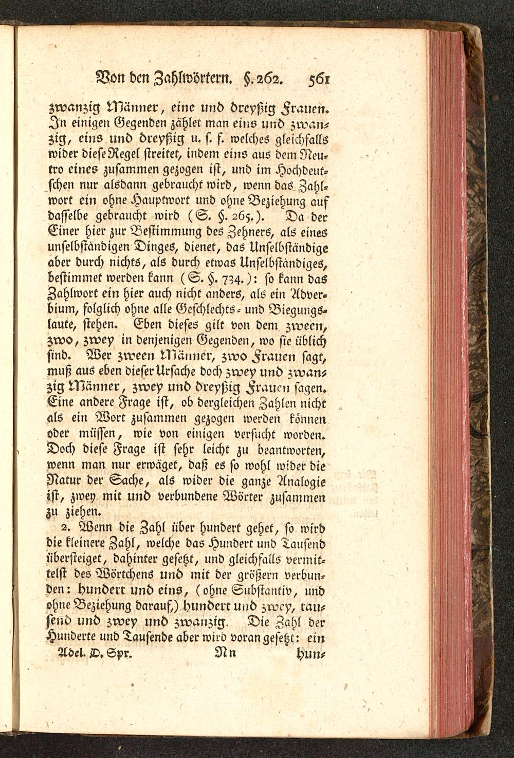 zwanzig Männer, eine und dreyßig Frauen.In einigen Gegenden zählet man eins und zwan-zig, eins und dreyßig u. s. f. welches gleichfallswider diese Regel streitet, indem eins aus dem Neu-tro eines zusammen gezogen ist, und im Hochdeut-schen nur alsdann gebraucht wird, wenn das Zahl-wort ein ohne Hauptwort und ohne Beziehung aufdasselbe gebraucht wird (S. §.26;.). Da derEiner hier zur Bestimmung des Zehners, als einesunselbständigen Dinges, dienet, das Unselbständigeaber durch nichts, als durch etwas Unselbständiges,bestimmet werden kann (S. §. 7Z4.): so kann dasZahlwort ein hier auch nicht anders, als ein Adver-bium, folglich ohne alle Geschlechts - und BiegungS-laute, stehen. Eben dieses gilt von dem zween,zwo, zwey in denjenigen Gegenden, wo sie üblichsind. Wer zween Männer, zwo Frauen sagt,muß aus eben dieser Ursache doch zwey und zwan-zig Männer, zwey und dreyßig Frauen sagen.Eine andere Frage ist, ob dergleichen Zahlen nichtals ein Wort zusammen gezogen werden könnenoder müssen, wie von einigen versucht worden.Doch diese Frage ist sehr leicht zu beantworten,wenn man nur erwäget, daß es so wohl wider dieNatur der Sache, als wider die ganze 'Analogieist, zwey mit und verbundene Wörter zusammenzu ziehen.