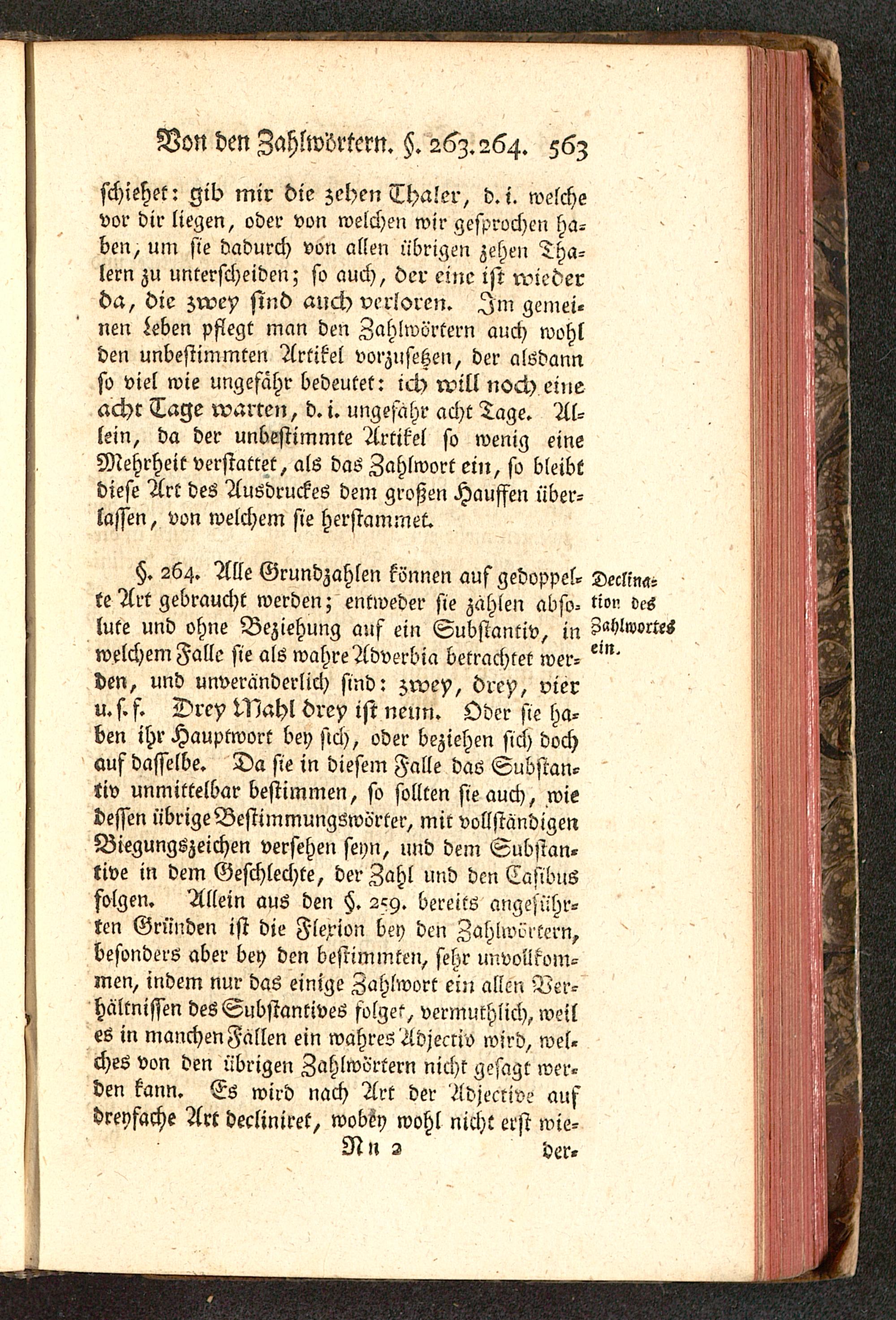 §. 264. Alle Grundzahlen können auf gedoppel- Decima-le Art gebraucht werden; entweder sie zählen abso- tion veslute und ohne Beziehung aus ein Substantiv, in Zahlworteswelchem Falle sie als wahre Adverbia betrachtet wer-den, und unveränderlich sind: zwey, drey, vieru. s. f. Drey Mahl drey ist neun. Oder sie ha-ben ihr Hauptwort bey sich, oder beziehen sich dochauf dasselbe. Da sie in diesem Falle das Substan-tiv unmittelbar bestimmen, so sollten sie auch, wiedessen übrige Bestimmungswörter, mit vollständigenBiegungszeichen versehen seyn, und dem Substan-tive in dem Geschlechte, der Zahl und den CasibuSfolgen. Allein aus den §. 2-9. bereits angeführ-ten Gründen ist die Flexion bey den Zahlwörtern,besonders aber bey den bestimmten, sehr unvollkom-men, indem nur das einige Zahlwort ein allcn Ver-hältnissen des Substantives folget, vermuthlich, weiles in manchen Fällen ein wahres Adjectiv wird, wel-ches von den übrigen Zahlwörtern nicht gesagt wer-den kann. Es wird nach Art der Adjective aufdreyfache Art decliniret, wobey wohl nicht erst wie-