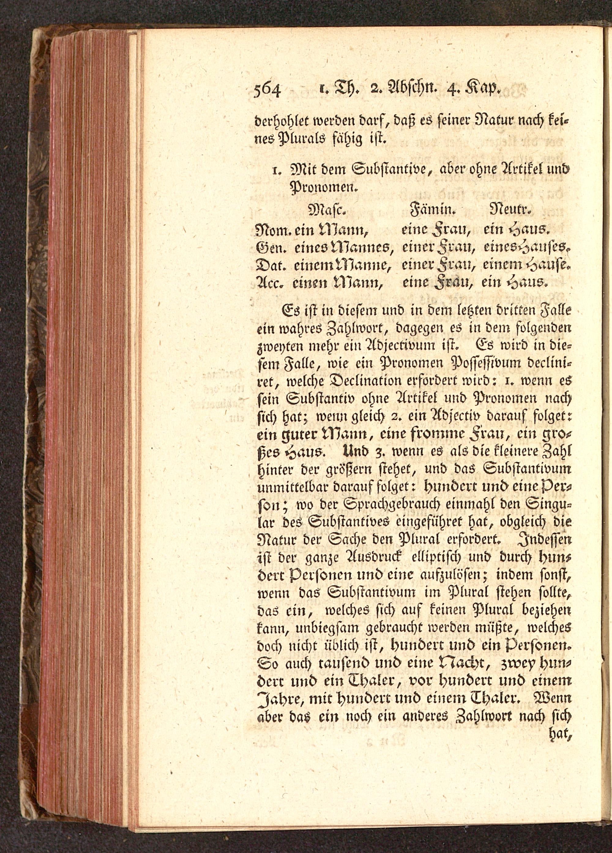 Es ist in diesem und in dem letzten dritten Falleein wahres Zahlwort, dagegen es in dem folgendenZweyten mehr ein Adjectivum ist. Es wird in die-sem Falle, wie ein Pronomen Possessivum declini-ret, welche Declination erfordert wird: 1. wenn e6sein Substantiv ohne Artikel und Pronomen nachsich hat; wenngleich 2. ein Adjectiv darauf folget:ein guter Mann, eine fromme Frau, ein gro-ßes Haus. Und 3. wenn es als die kleinere Zahlhinter der größern stehet, und das Substantivumunmittelbar darauf folget: hundert und eine Per-son; wo der Sprachgebrauch einmahl den Singu-lar des Substantives eingeführet hat, obgleich dieNatur der Sache den Plural erfordert. Indessenist der ganze Ausdruck elliptisch und durch hun?derc Personen und eine aufzulösen; indem fönst,wenn das Substantivum im Plural stehen sollte,das ein, welches sich auf keinen Plural beziehenkann, unbiegsam gebraucht werden müßte, welchesdoch nicht üblich ist, hundert und ein Personen.So auch rausend und eine Z^acht, zwey Hun-dcrc und ein Thaler, vor hundert und einemJahre, mir hundert und einem Thaler. Wennaber das ein noch ein anderes Zahlwort nach sich
