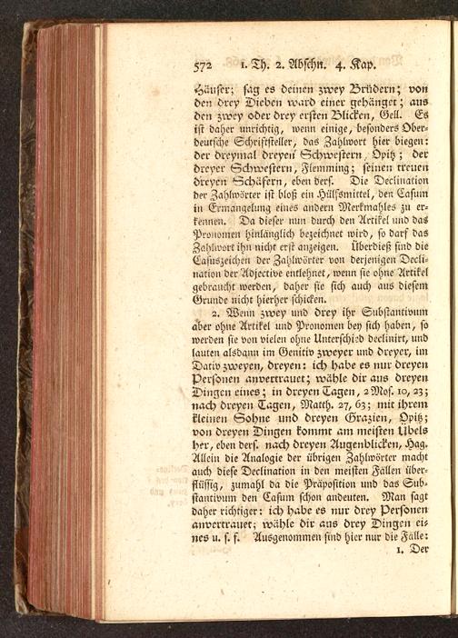 Häujer; sag es deinen zwey Vrüdern; vonden drey Dieben ward einer gchängec; ausden zwey oder drey ersten Blicken, Gell. Esist daher unrichtig, wenn einige, besonders Ober-deutsche Schriftsteller, das Zahlwort hier biegen:der dreymal dreyen' Schwestern., OpiH ; derdreyer Schwestern, Flemming; seinen rreuendreyen Schäfern, eben ders. Die Declinationder Zahlworter ist bloß ein Hülfsmittel, den Casumin Ermangelung eines andern Merkmahles zu er-kennen. Da dieser nun durch den Artikel und dasPronomen hinlänglich bezeichnet wird, so darf dasZahlwort ihn nicht erst anzeigen. Überdies; sind dieCasuszeichen der Zahlwörter von derjenigen Decli-nation der Adjective entlehnet, wenn sie ohne Artikelgebraucht werden, daher sie sich auch aus diesemGrunde nicht hierher schicken.