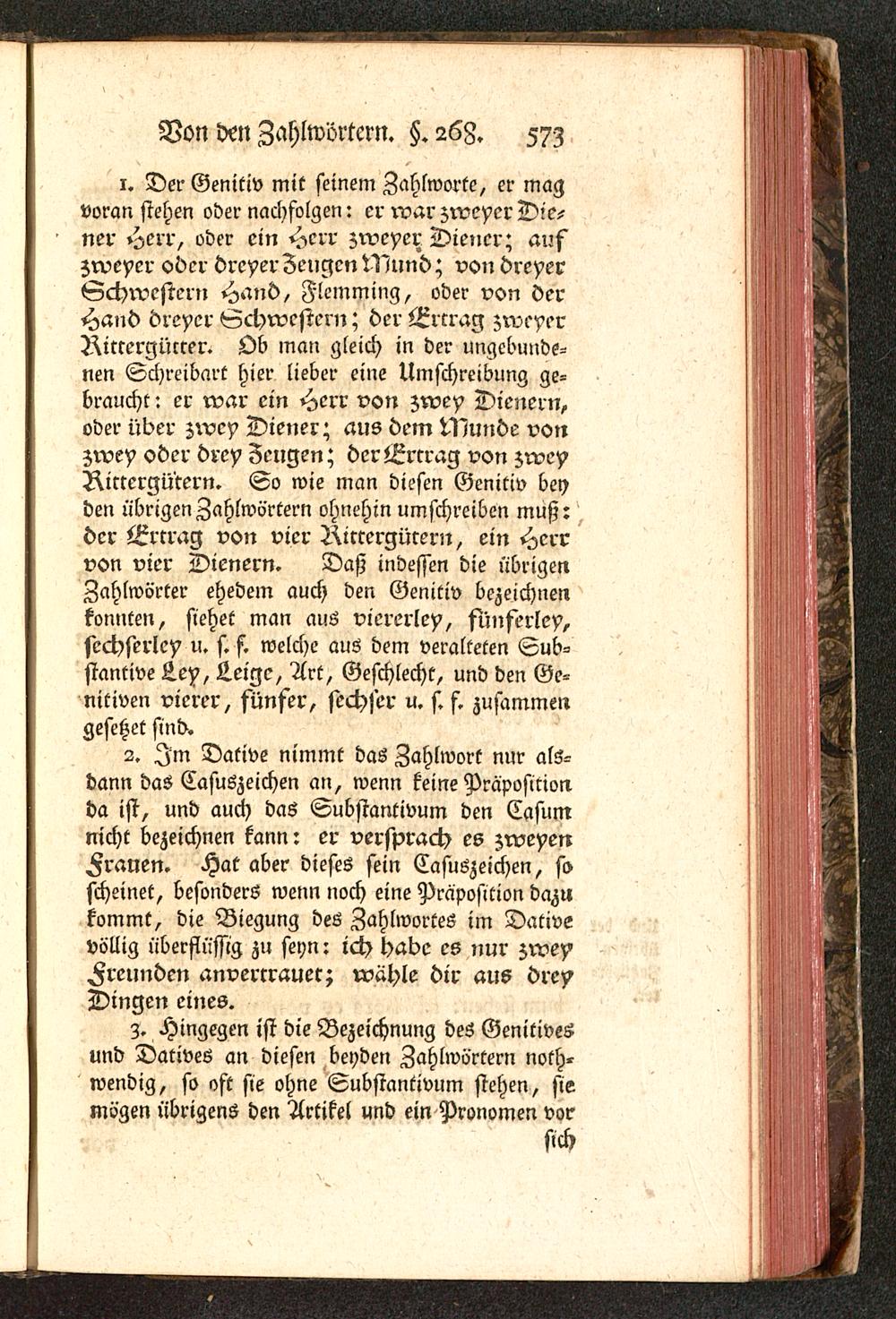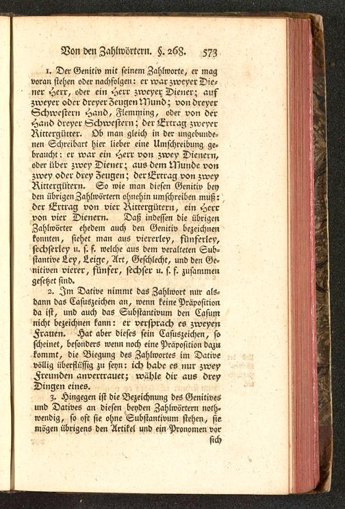 z. Hingegen ist die Bezeichnung des Genitivesund Datives an diesen beyden Zahlwörtern noth»wendig, so oft sie ohne Substantivum stehen, siemögen übrigens den Artikel und ein Pronomen vor