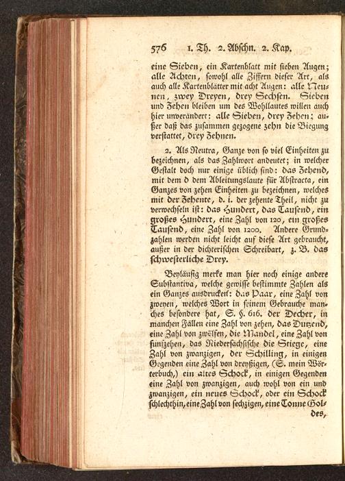 Beyläufig merke man hier noch einige andereSubstantiv«, welche gewisse bestimmte Zahlen alsein Ganzes ausdrucket: d.-.s paar, eine Zahl vonzweyen, welches Wort in ftinem Gebrauche man.ches besondere hat, S. §. 616. der Decher, inmanchen Fällen eine Zahl von zehen, das Durzend,eine Zahl von zwölfen, die Mandel, eine Zahl vonfunfzehen, das Niedersächsische die Stiege, eineZahl von zwanzigen, der Schilling, in einigenGegenden eine Zahl von dreyßiger«, (S. mein Wör-terbuch,) ein alres Schock, in einigen Gegendeneine Zahl von zwanzigen, auch wohl von ein undzwanzigen, ein neues Schock, oder ein Schockschlechthin, eine Zahl von sechziger,, eine Tonne Gol-des,