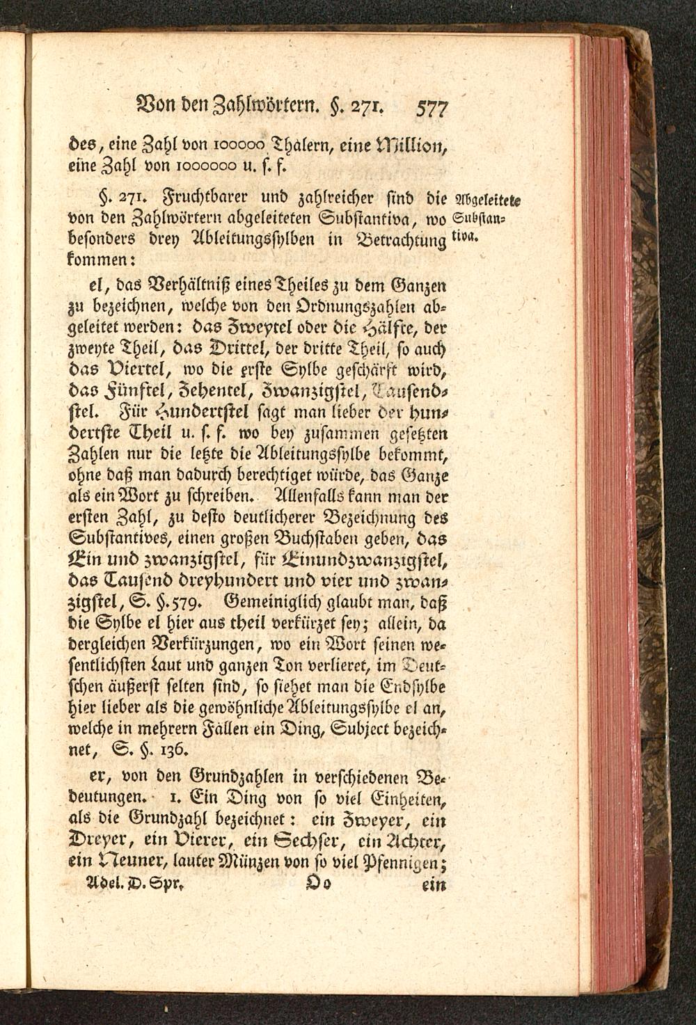 el, das Verhältniß eines Theiles zu dem Ganzenzu bezeichnen, welche von den Ordnungszahlen ab-geleitet werden: das Zweyte! oder die Hälfte, derzweyte Theil, das Drittel, der dritte Theil, so auchdas Viertel, wo die erste Sylbe geschärft wird,das Fünftel, Zchenrel, Zwanzigstel, L ausend-stel. Für Hundertstel sagt man lieber der hun-dertste Theil u. s. f. wo bey zusammen gesetztenZahlen nur die letzte die Ableitungssylbe bekommt,ohne daß man dadurch berechtiget würde, das Ganzeals ein Wort zu schreiben. Allenfalls kann man derersten Zahl, zu desto deutlicherer Bezeichnung desSubstantives, einen großen Buchstaben geben, dasjAn und zwanzigstel, für Einundzwanzlgjtel,das Taujend dreihundert und vier und zwan-zigstel, S. §.579. Gemeiniglich glaubt man, daßdie Sylbe el hier aus theil verkürzet sey; allein, dadergleichen Verkürzungen, wo ein Wort seinen we-sentlichsten iaut und ganzen Ton verlieret, im Deut-schen äußerst selten sind, so siehet man die Endsylbehier lieber als die gewöhnliche Ableitungssylbe el an,welche in mehrern Fällen ein Ding, Subject bezeich-net, S. §. iz6.