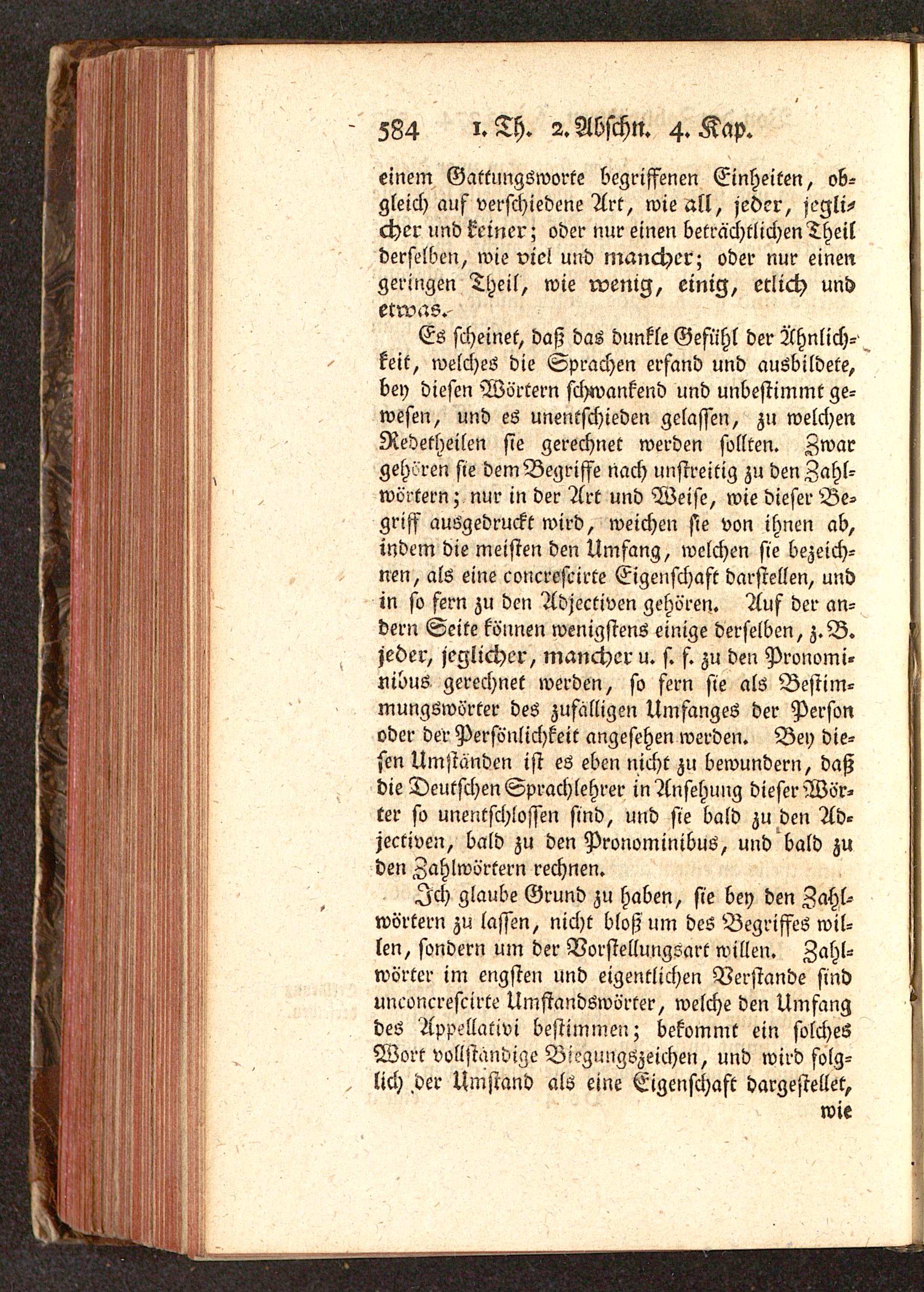 Ich glaube Grund zu haben, sie bey den Zahl-wörtern zu lassen, nicht bloß um des Begriffes wil-len, sondern um der Vorstellungsart willen. Zahl-wörter im engsten und eigentlichen Verstände sindunconcrescirte Umstandswörter, welche den Umfangdes Appellativ! bestimmen; bekommt ein solchesWort vollständige Bi?gungszeichen, und wird folg-lich der Umstand als eine Eigenschaft dargestellet,