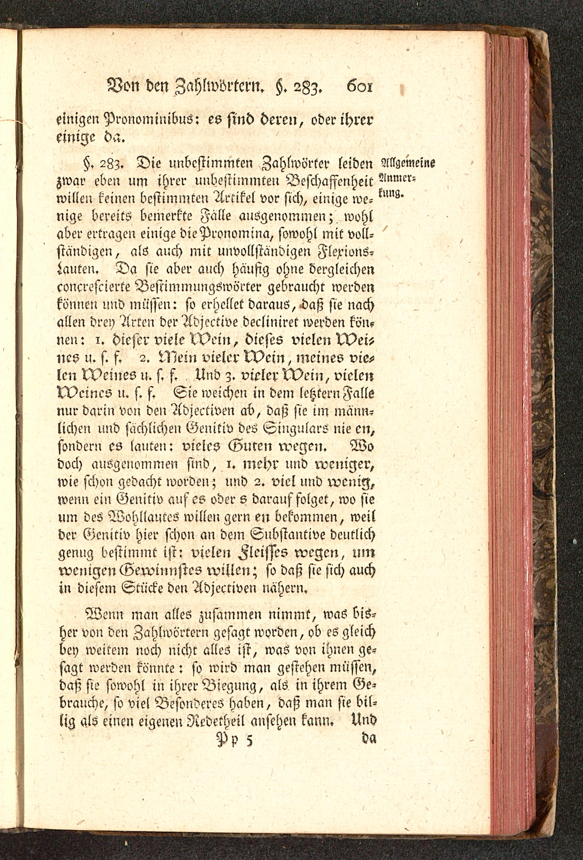 §. 28z. Die unbestimmten Zahlwörter leiden Allgemeinezwar eben um ihrer unbestimmten Beschaffenheit -lnmcr-willen keinen bestimmten Artikel vor sich, einige we-nige bereits bemerkte Falle ausgenommen; wohlaber ertragen einige die Pronomina, sowohl mit voll-ständigen, als auch mit unvollständigen Flexions-iauten. Da sie aber auch häufig ohne dergleichenconcrescierte Bestimmungswörter gebraucht werdenkönnen und müssen: so erhellet daraus,-daß sie nachallen drey Arten der Adjective decliniret werden tön?neu: 1. dieser viele Mein, dieses vielen Mei-nes u. s. f. 2. Mein vieler Mein, meines vie-len Meines u. s. f. Und z. vieler Mein, vielenMeines u. s. f. Sie weichen in dem lehtern Fallsnur darin von den Adjectiven ab, daß sie im männ-lichen und sächlichen Genitiv des Singulars nie en,sondern es lauten: vieles Guten wegen. Wodoch ausgenommen sind, 1. mehr und weniger,wie schon gedacht worden; und 2. viel und wenig,wenn ein Genitiv auf es oder s darauffolget, wo sieum des Wohllautes willen gern en bekommen, weitder Genitiv hier schon an dem Substantive deutlichgenug bestimmt ist: vielen Fleisses wegen, umwenigen Gewinnstes willen; so daß sie sich auchin diesem Stücke den Adjectiven nähern.