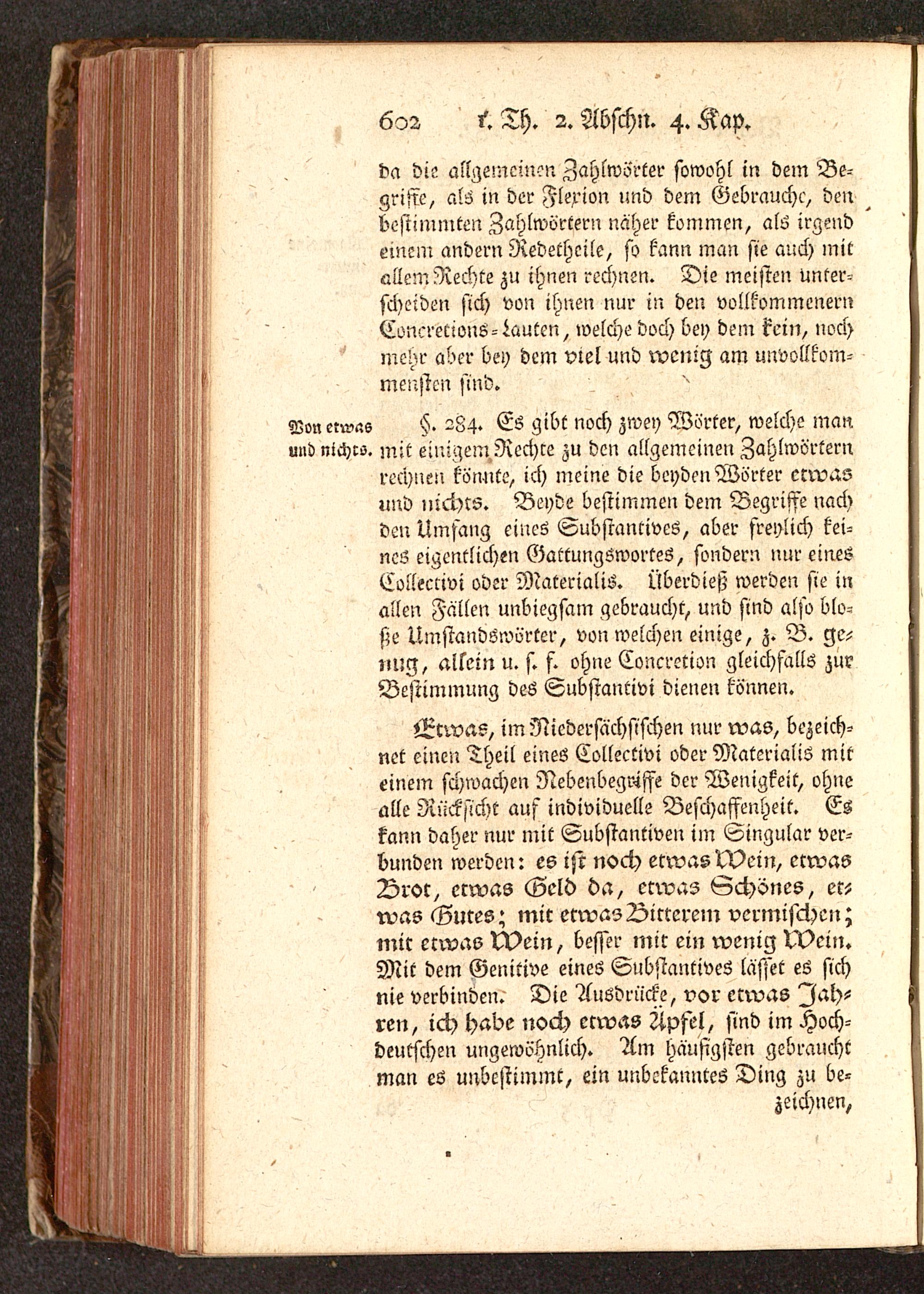 »Awas, im Nicdersächsischen nur was, bezeich-net einen Theil eines Collectivi oder Materialis miteinem schwachen Nebenbegviffe der Wenigkeit, ohnealle Rücksicht aus individuelle Beschaffenheit. Eskann daher nur mit Substantiven im Singular ver-bunden werden: es izr noch etwas Mein, etwasDror, erwas Geld da, etwas Schönes, et-was Gutes; mit etwas Bitteren? vermischen;mir etwas N>ein, besser mit ein wenig N)ein.Mit dem Genitive eines Substantives lässet es sichnie verbinden. Die Ausdrücke, vor etwas Jah-ren, ich habe noch etwas Zipfel, sind im Hoch-deutschen ungewöhnlich. Am hausigsten gebrauchtman es unbestimmt, ein unbekanntes Ding zu be-zeichnen,