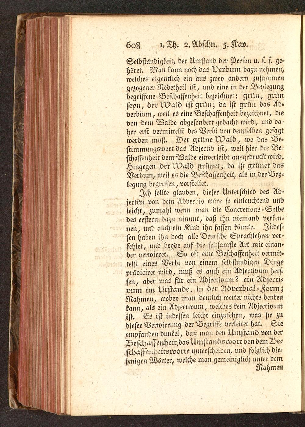 Ich sollte glauben, dieser Unterschied des Ad-jectiv! von dein Adverbs wäre so einleuchtend undleicht, zumahl wenn man die Concretions-Sylbedes erstem dazu nimmt, daß ihn niemand verken-nen, und auch ein Kind ihn fassen könnte. Indes-sen haben ihn doch alle Deutsche Sprachlehrer ver-fehlet, und beyde auf die seltsamste Art miteinan-der verwirret« So oft eine Beschaffenheit vermit-telst eines Verbi von einem selbständigen Dingeprädiciret wird, muß es auch ein Adjectivum heis-sen, aber was für ein Adjectivum? ein Adjecti-vum im Nrstande, in der Adverbial-Form;Nahmen, wobey man deutlich weiter nichts denkenkann, als ein Adjectivum, welches kein Adjectivumtst. Es ist indessen leicht einzusehen, was sie zudieser Verwirrung der Begriffe verleitet hat. Sieempfanden dunrel, daß man den Umstand von derDesci)afsenhcic,das Umstandsworc von dem Ve-schaffeiu/^itsworce unterscheiden, und folglich die-jenigen Wörter, welche man gemeiniglich unter dem