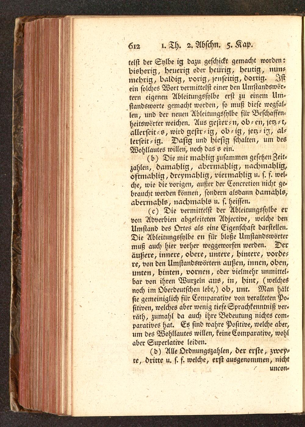 (c) Die vermittelst der Ableitungssylbe ervon Adverbien abgeleiteten Adjective, welche denUmstand des Ortes als eine Eigenschaft darstellen.Die Ableitungssylbe en für bloße Umstandswörtermuß auch hier vorher weggeworfen werden. Deräußere, innere, obere, untere, Hintere, vorde-re, von den Umstandswörtern außen, innen, oben,unten, hinten, vornen, oder vielmehr unmittel-bar von ihren Wurzeln aus, in, hinr, (welchesnoch im Oberdeutschen lebt,) ob, unr. Man haltsie gemeiniglich für Comparative von veralteten Po-sitiven, welches aber wenig tiefe Sprachkenntniß ver-rath, zumahl da auch ihre Bedeutung nichts com-paratives hat. Es sind wahre Positive, welche aber,um des Wohllautes willen, keine Comparative, wohlaber Superlative leiden.