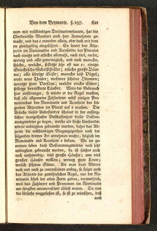 num mit vollständigen Declinationslauten, hat dieOberdeutsche Mundart auch hier Ausnahmen ge«macht, und das e entweder allein, oder doch mit demen gleichgültig eingeführet. So lautet das Adje-jectiv im Nominative und Accusativs des Pluralesnach einige und etliche allemahl, nach viel, mehr,wenig und alle gemeiniglich, und nach manche,solchc, welche, selbige sehr oft nur e: einigeGriechische Schriftsteller; etliche große Bäu-me; alle übrige Gäste; manche lose Dögel;viele neue Thaler; mehrere schöne Blumen;wenige gute Vorsätze; welche reiche Güter;selbige bevölkerte Länder. Wäre der Gebrauchhier einförmiger, so würde er die Regel machen,daß alle allgemeine Zahlwörter nebst einigen Pro-nominibuö den Nominativ und Accusativ des fol-genden Adjectives im Plural auf e machen. DieUrsache dieses Unbestandes scheinet in der anfäng-lichen mangelhafen Beschaffenheit dieser Bestim-mungswörter zu liegen, welche als bloße Umstands-wörter unbiegsam gebraucht wurden, daher das Ad-jectiv die vollständigen Biegungszeichen nach derfolgenden dritten Art annehmen mußte, folglich imNominativ und Accusativ e bekam. Wo im ge.meinen ieben diese Bestimmungswörter noch jchtunbiegsam gebraucht werden, da ist solches auchnoch nothwendig: viel große Häuser; um vielgroßer Häuser willen; wenig gute Leute;welch schöne Güter. Als man diese Wörcernach und nach zu concrescieren anfing, so folgte auchdas Adjectiv der gewöhnlichen Regel, nur der No-minativ blieb der alten Form getreu, vermuthlich,weil das Zahlwort und Pronomen im Nominativam längsten unconcresciert üblich waren. Da nundie Ursache weggefallen ist, so ist zu wünschen, daß