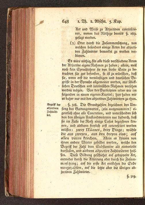 Es wäre nöthig, für alle diese verschiedene Artender Adjective eigene Nahmen zu haben; allein, weilnoch kein Sprachlehrer sie von dieser Seite zu be-trachten für gut besunden, so ist zu wünschen, daßsie, wenn erst die vernünftigen und deutlichen Be-griffe in der Sprache allgemeiner werden, mit scbick-- lichen Deutschen und Lateinischen Nahmen versehenwerden mögen. Von den Participien reden wir imfolgenden in einem eigenenKapitel; hier haben wires daher nur mit den adjectivenZahlwörtern zu thun.