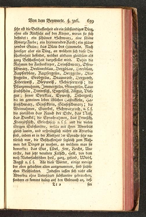 sehr oft die Beschaffenheit als ein selbständiges Ding,ohne alle Rücksicht auf den Körper, woran sie sichbefindet: ein schönes Schwarz, eine schöneschwarze Farbe; ein brennendes Roch; ein glän-zendes Grün; das Vlau des Himmels. Nochhanfiger aber ein Ding, an welchem sich diese Be-schaffenheit befindet, welches alsdann gleichsam alsganz Beschaffenheit dargestellet wird. Dahin dieNahmen der Farbenkörper, 2^einschwar;, Gfen-schwarz, Dcrlmerblau, Aergblau, ^eerklau,Kupferblau, Kupfergrün, ^erggrün, L>la-sengrün, Grobgrün, Vraunroth, Äergroth,Lederweiß, Dleyweiß, Gchieferweiß; diePflanzennahmen, Immergrün, Sinngrün,Tau--sendschön, Licrersüß, Liwgeljüß, 2lUgur, Viel-gur; ferner Eyerklar, L^yweij), Bibergeil;die im gemeinen ieben üblichen Hasenklein, Ha-senschrvarz, Gänscklcin, Gänseschwarz; dieWeinnahmen, Gutcdel, Schwarzroth, u. s. f.die poetischen das Rund der L^rde, das ITlaß,das Dunkel; die Sprachnahmen, das Deutsch ,Französisch, Griechisch u. s. f. und die vielenübrigen Substantive, welche mit ihren AdverbiiSgleich lauten, und ursprünglich nichts als Adverbiasind, indem es in der Kindheit der Sprache sehr na-türlich war, die Beschaffenheit sogleich zum Nah-men des Dinges zu machen, an welchem man siebemerkte: das Gut, Übel, Fett, Recht, Un-recht, das jetzt veraltete Falsch, Heil, von demnoch Niedersachsischen hei!, ganz, gesund, 5Vc>l?l,Angst u. s. f. Alle diese Wörter, einige wenigeder eben gedachten alten ausgenommen, sind sachli-chen Geschlechtes. Indessen lassen sich nicht alleAdverbia ohne Unterschied substantive gebrauchen,sondern es kommt dabey auf den Gebrauch an, des-